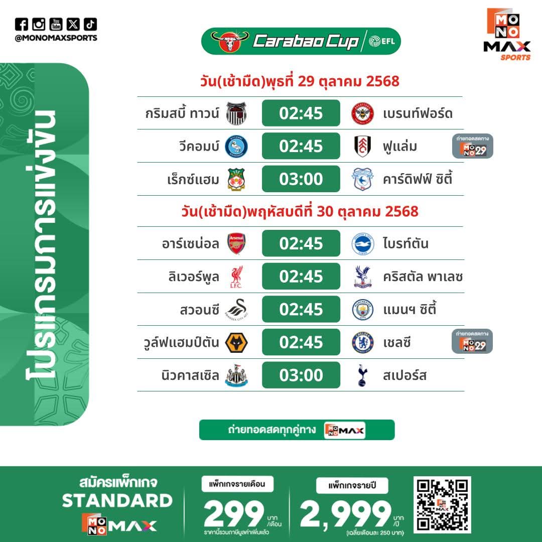 🔎 ข่าวดี! อัพเดทโปรแกรม 📺 ถ่ายทอดสดศึก คาราบาว คัพ 2025/26 (รอบ4)