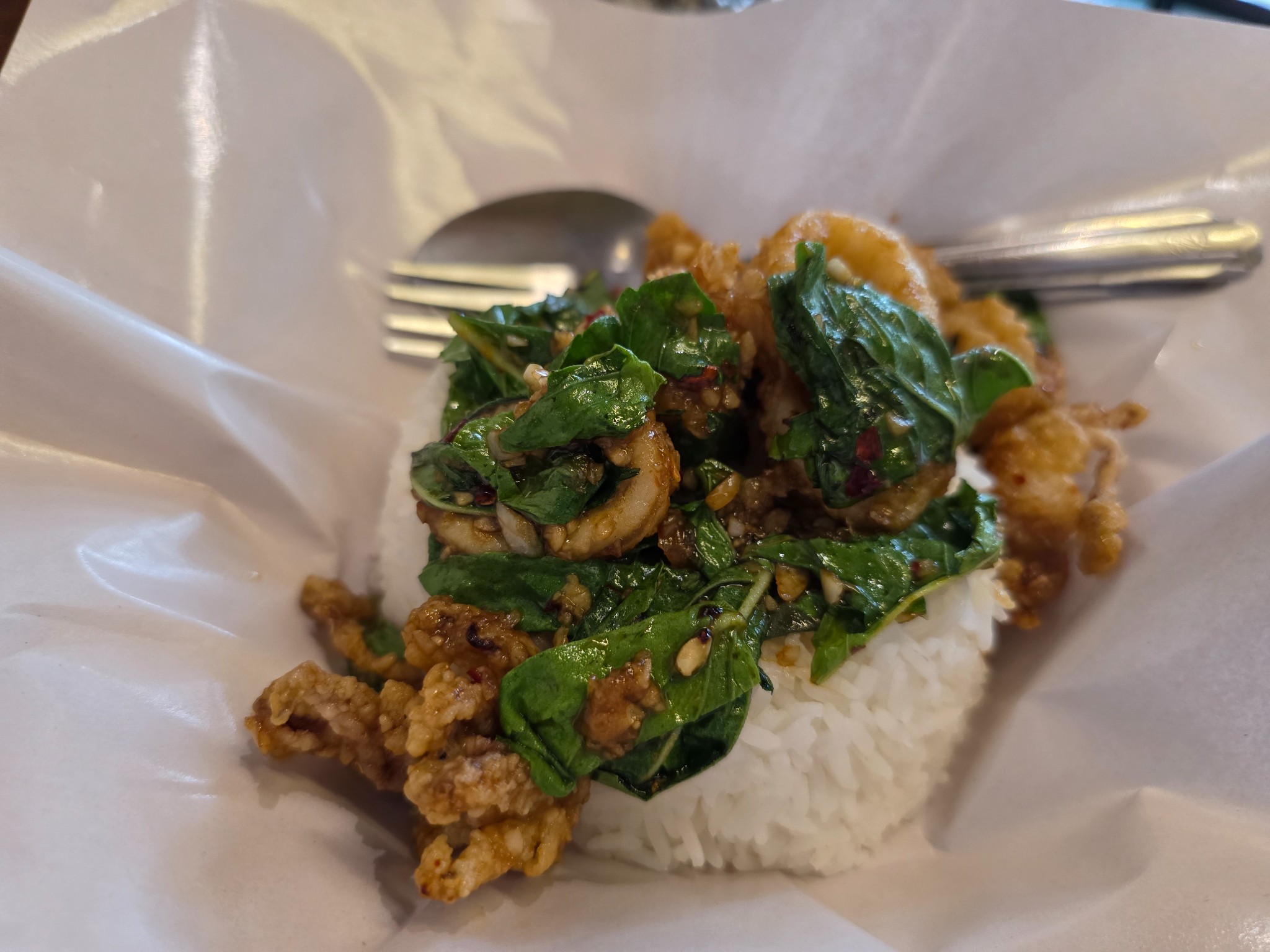 กะเพราหมึกกรอบ เผ็ดน้อย: จานนี้ก็ดีงามไม่แพ้กัน! หมึกกรอบหนึบๆ ผัดกับพริกและใบกะเพราหอมๆ