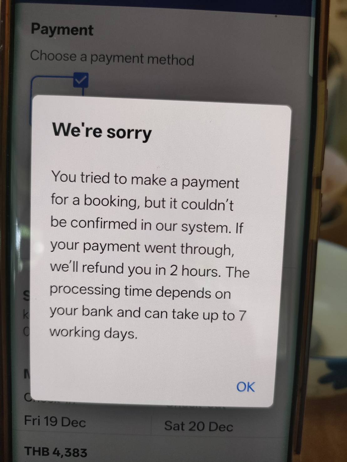 จองที่พักในไทยผ่าน booking.com จองยังไงก็ไม่สำเร็จ ขึ้นแบบนี้ค่ะ