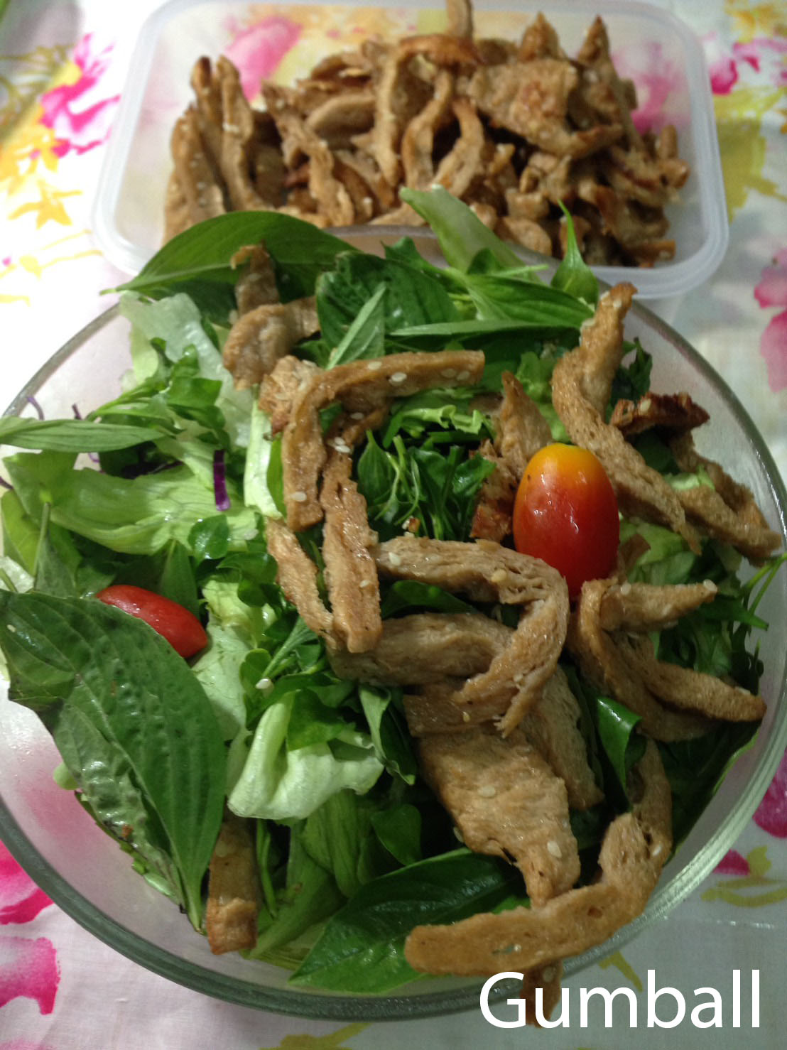 กัมบอลใส่ในสลัดไม่ได้ทำน้ำสลัดนะคะ เพราะในโปรตีนเกษตรมีรสชาติที่ดี โรยๆโปรตีนพริกไทยดำแล้วคลุกๆ กินเลยค่ะ