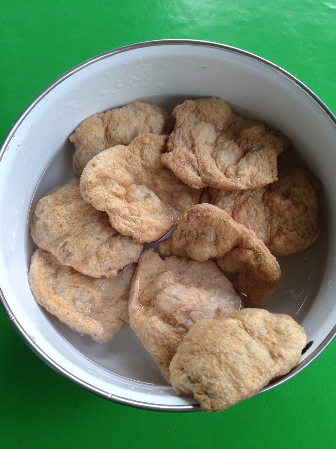 โปรตีนเกษตรเราจะใช้แผ่นใหญ่ นำมาแช่น้ำให้นุ่ม และบีบน้ำทิ้งหลายๆน้ำ เพื่อกำจัดกลิ่นถั่วเหลืองให้หมดไป