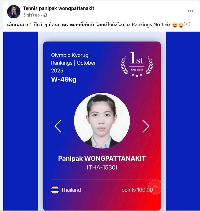 “เลิกเล่นมา 1 ปีกว่าๆ มีคนถามว่าตอนนี้อันดับโลกเป็นยังไงบ้าง Rankings No.1 ค่ะ