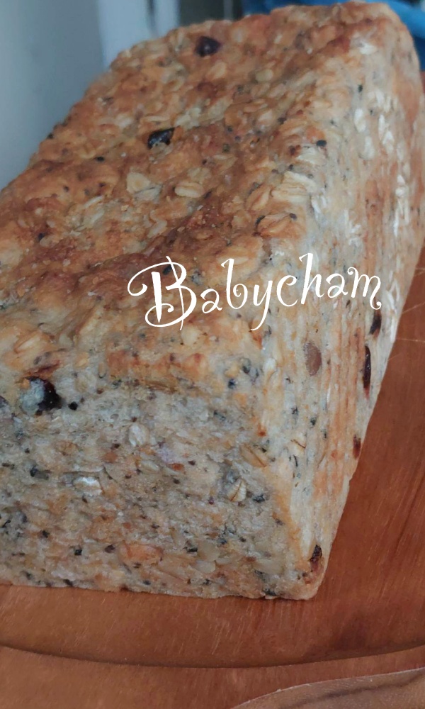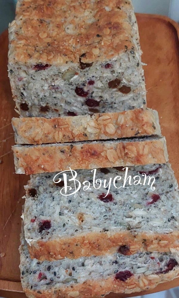 แล้วก็เพิ่มผลไม้อบแห้ง งาดำ เมล็ดแฟลกซ์ ลงไปด้วย ขนมปังนี้นุ่มค่ะ นุ่มมากๆ คุณพี่สาวการันตีเลย