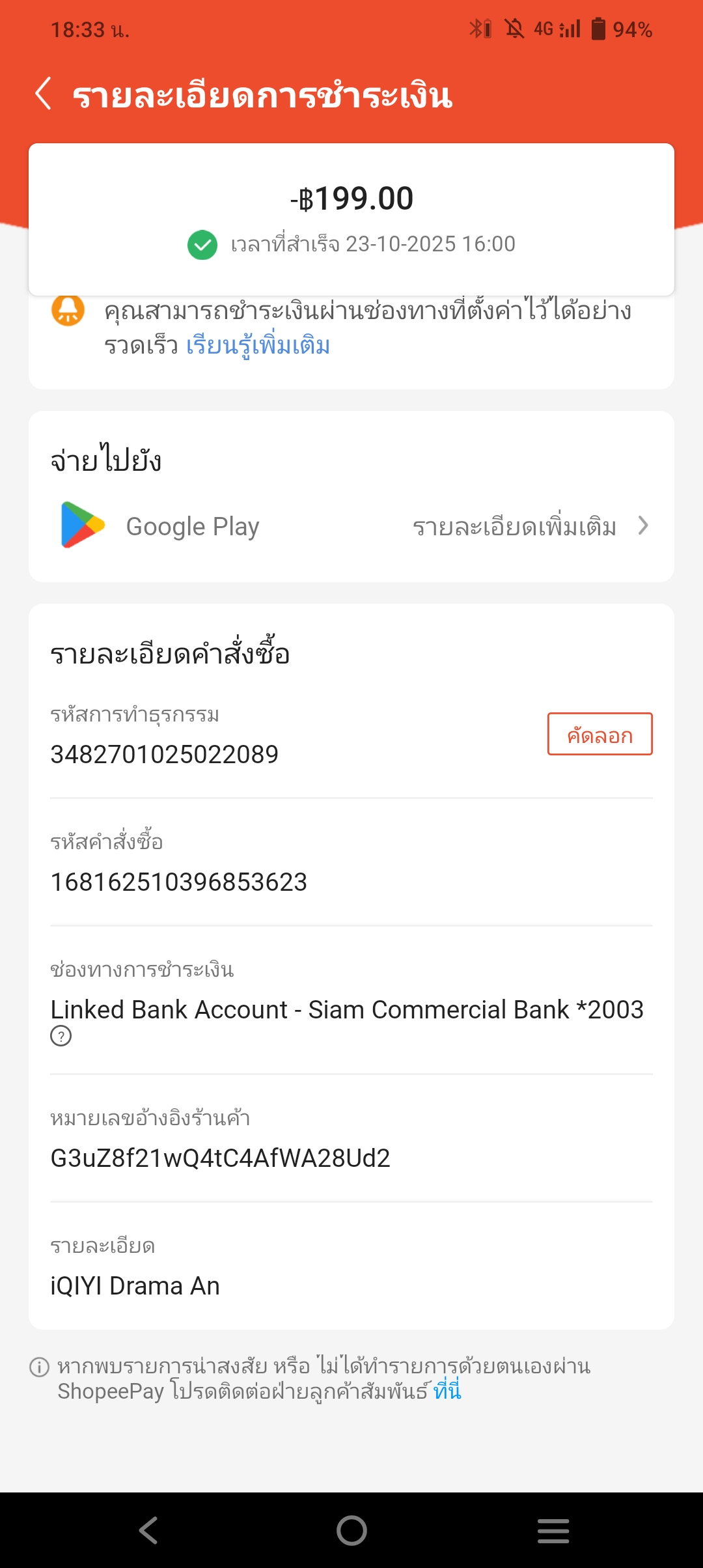 Shopeepay หักเงินอัตโนมัติ ให้ Googleplay