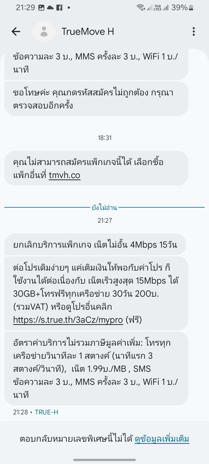 เติมเงินทรูเช้าไปประมาณ 70 บาทจะสมัครเน็ต จู่ๆก็มีข้อความเด้งขึ้นเต็มเลย แล้วก็หักเงินไปจนเติมเน็ตไม่ได้ ต้องการเงินคืน ต้องทำยังไง หดยกเลิก sms แล้วก็ไม่ได้คืน