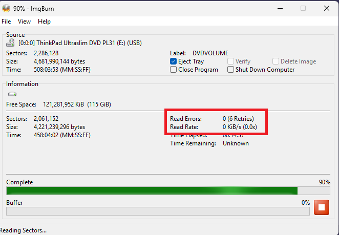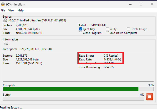 ปกติจะอ่านแผ่นด้วยความเร็ว1,000-3,800KiB/s ถ้าอ่านไม่ได้ความเร็วจะเหลือ0KiB/s โปรแกรมจะลองอ่านใหม่หลายรอบ ถ้าไม่สำเร็จจะแจ้งเตือน ด้วยความอารมณ์เสียผมเลยขยับ USB DVD Drive ไปมา เห็น Read Rate มันขึ้นมา 18KiB/s ข้อมูลทางซ้ายมันเพิ่มขึ้น แล้วก็เป็น 0KiB/s เหมือนเดิม