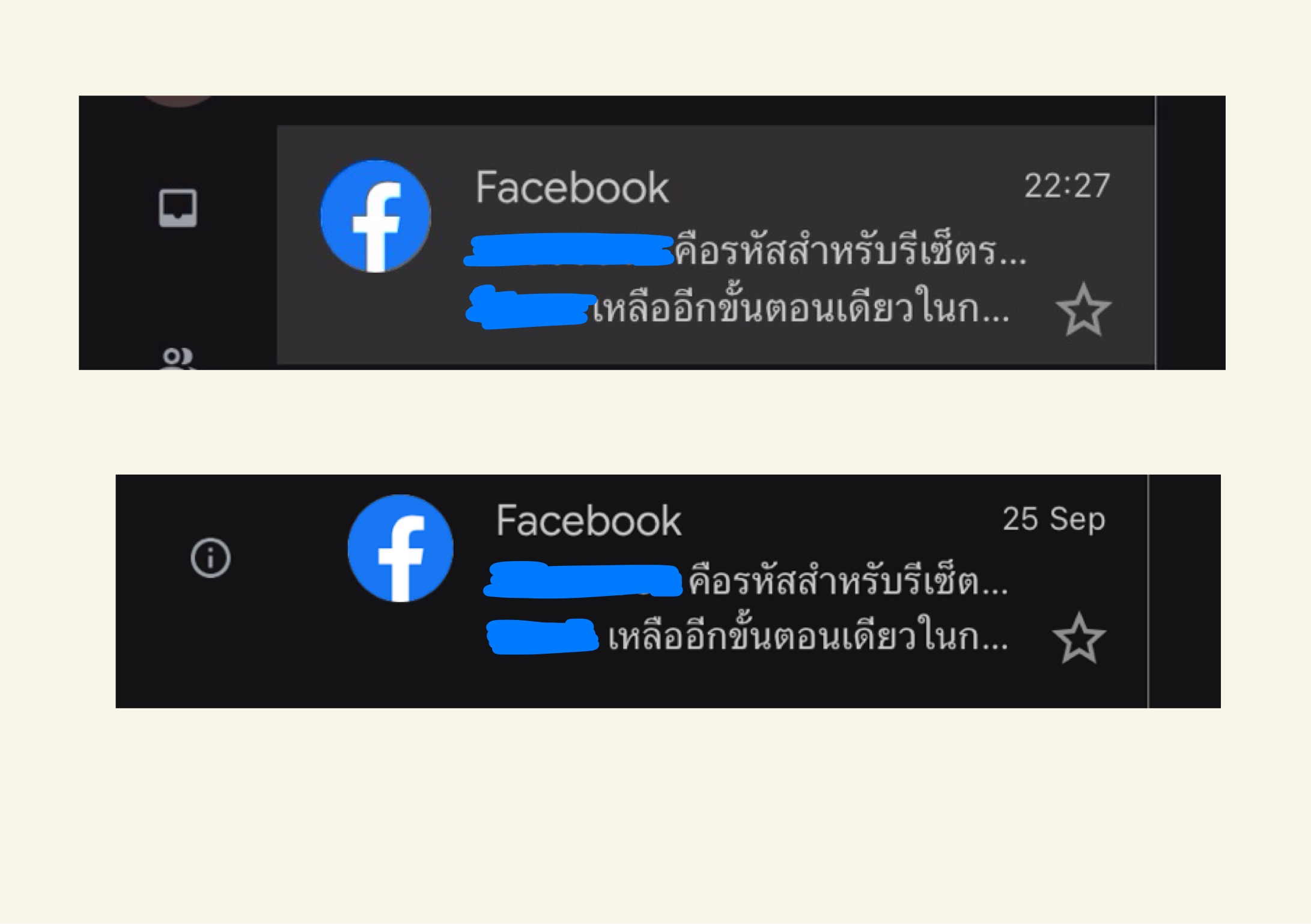 สวัสดีค่ะค่ะ เรื่องมีอยู่ว่ามีอีเมลขอรีเซ็ตรหัส fbส่งมาโดยที่เราไม่ได้เป็นคนขอรีเซ็ตเอง เบื้องต้นทำตามที่ fb บอกไปแล้วค่ะ แค่แจ้งว่าเราไม่ได้เป็นคนทำแล้วไม่ต้องทำอะไรเลย แต่ตอนนี่รู้สึกแพนิคหน่อยๆ เพราะเดือนที่แล้ว 25 ก.ย. ช่วง 23.00 เราก็ได้รับเมลนี้ไปแล้วรอบนึง รอบนี้ครั้งที่ 2 24 ต.ค. ช่วง 22.00 น. เราก็ได้รับอีเมลอีกรอบ ห่างกันหนึ่งเดือน แปลว่าเค้าพยายามอยู่เรื่อยๆใช่ไหมค่ะ เราควรทำไงดี ขอคำแนะนำด้วยค่ะ โชคดีที่ตั้งรหัส fb เป็นสองชั้นกลัวเกิดเหตุการนี้ขั้นอีก ใครแนะนำได้ช่วยแนะนำด้วยนะคะ ตอนนี้แอบคิดมากนิดหน่อย ไม่รู้จะปรึกษาใคร