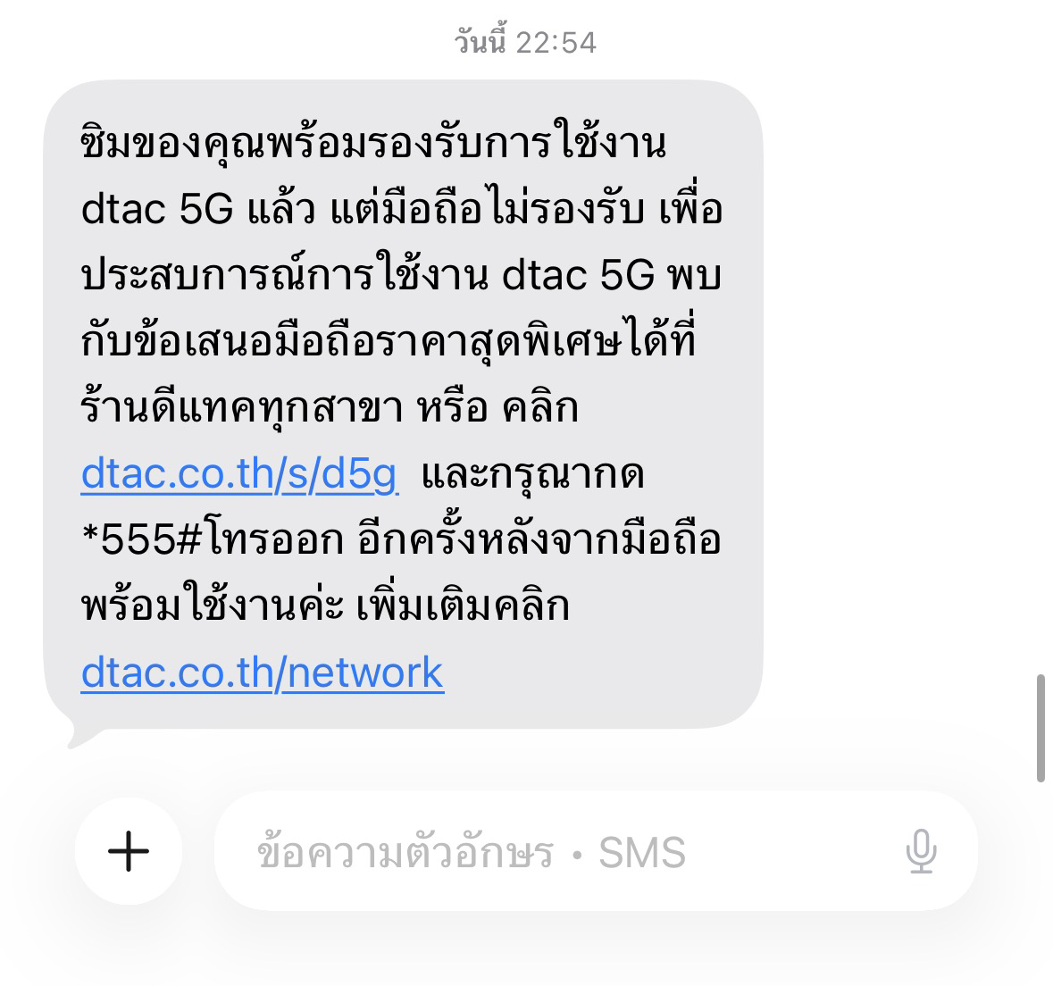คตามหัวข้อเลยค่ะ คือเรากด *555#แล้วได้ข้อความ “ซิมของคุณพร้อมรองรับการใช้งาน dtac 5G แล้ว แต่มือถือไม่รองรับ เพื่อประสบการณ์การใช้งาน dtac 5G พบกับข้อเสนอมือถือราคาสุดพิเศษได้ที่ร้านดีแทคทุกสาข