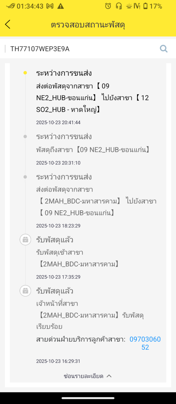 ผู้ส่งได้ส่งพัสดุตั้งแต่วันที่ 21 จากกรุงเทพฯ มาสตูล ซึ่งสถานะพัสดุล่าสุดคือวันที่ 22 อยู่หาดใหญ่ ผ่านมาจนถึงวันที่ 25 แล้ว ก็ยังไม่มีการอัพเดตเลย ติดต่อเจ้าหน้าที่ไปก็มีข้อความว่ามีลูกค้าติดต่อจำนวนม