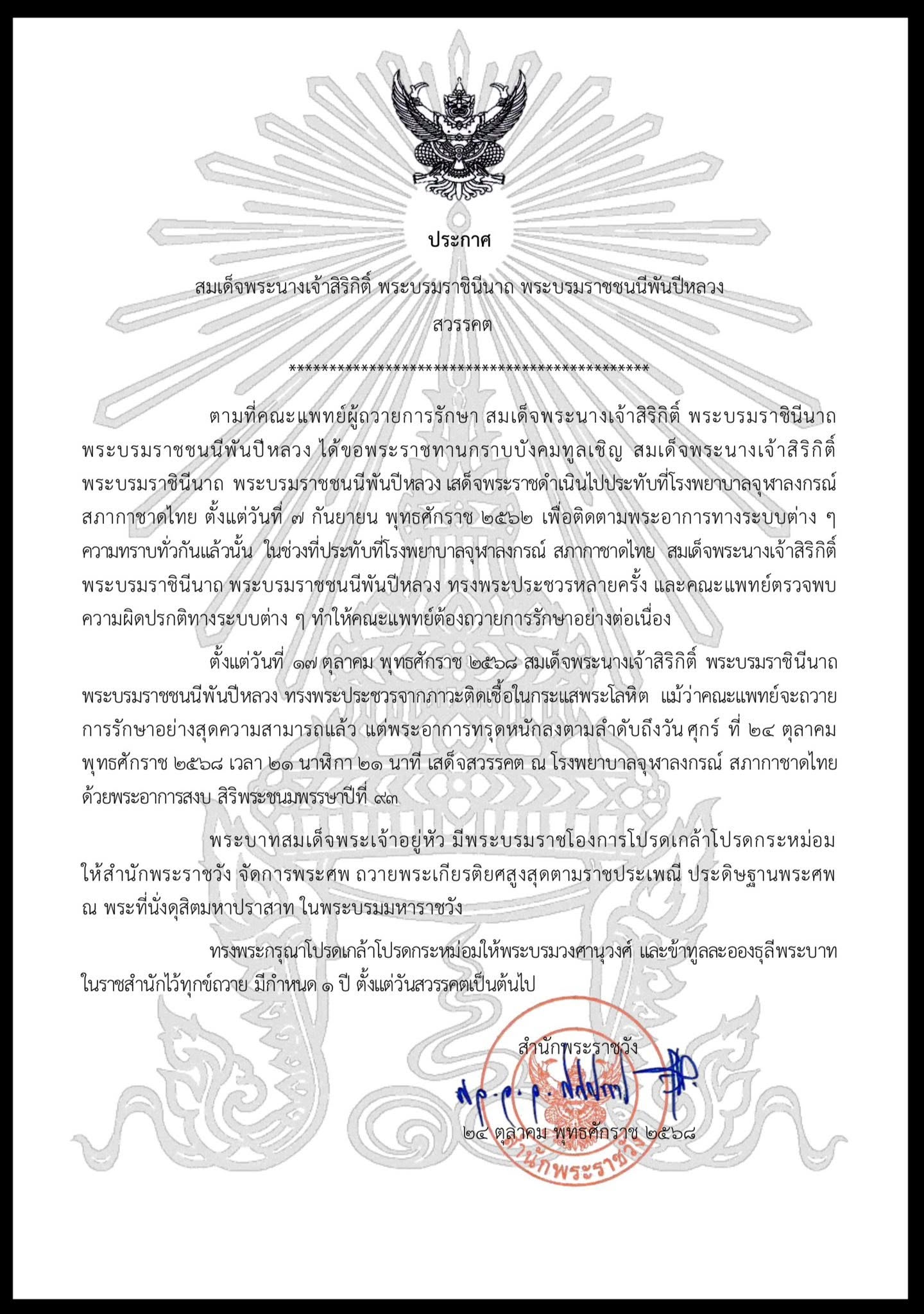 สำนักพระราชวัง เผยแพร่ประกาศ สมเด็จพระนางเจ้าสิริกิติ์ พระบรมราชินีนาถ พระบรมราชชนนีพันปีหลวง สวรรคต