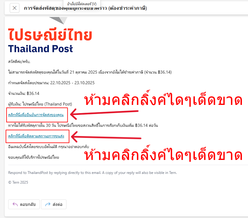 Email แบบนี้จริงๆก็มาบ่อย แต่ก็รู้ว่านี้ไม่ใช่ ไปรษณีย์ไทย มันบอกว่า ไม่สามารถจัดส่งพัสดุของคุณได้ในวันที่ 21 ตุลาคม 2025 เนื่องจากยังไม่ได้ชำระค่าภาษี (จำนวน ฿36.14) จริงๆมันใส่จำนวนเงินน้อยๆเพื่อให้เราหลงคลิกลิ์งค์เท่านั่น จริงๆไปรษณีย์บ้านผมก็มีห่างจากบ้านผมไม่ถึง200เมตร ถ้ามีอะไรเขาจะมาบอกเอง ถ้าหลงคลิกลิ์งค์เมื้อไหร่ข้อมลูต่าง หรือ เงินในบันชีอาจหายหมดทั้งบันชี ก็ได้ จึงเตือนๆมา ครับอย่าหลงคลิกลิ์งค์ไดๆเด็ดขาด