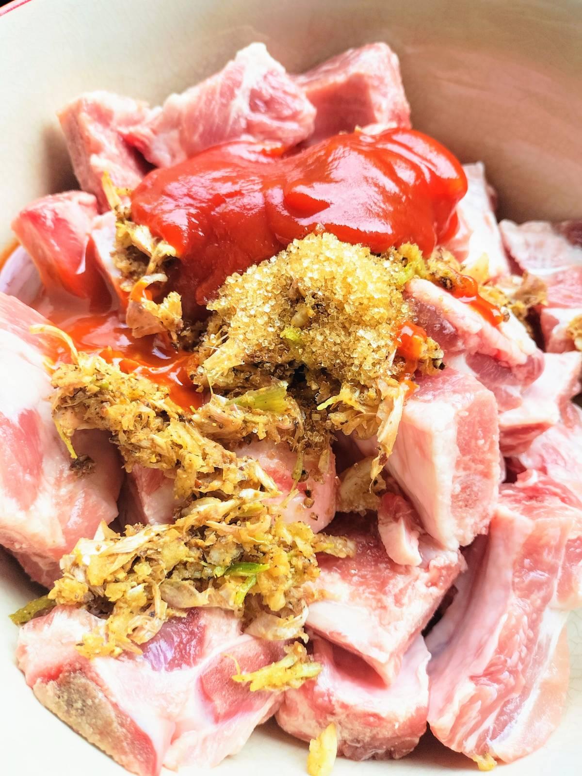 1. หมักซี่โครงหมู ด้วยสามเกลอ (รากผักชี กระเทียม พริกไทย ตำรวมกันพอละเอียด) น้ำมันหอย ซีอิ๊วขาว น้ำตาล ซอสพริก และซอสมะเขือเทศ หมักไว้ประมาณ 30 นาที หรือหมักข้ามคืนก็ยิ่งดีค่ะ เพื่อให้รสซึมเข้าเนื้อ 🕒