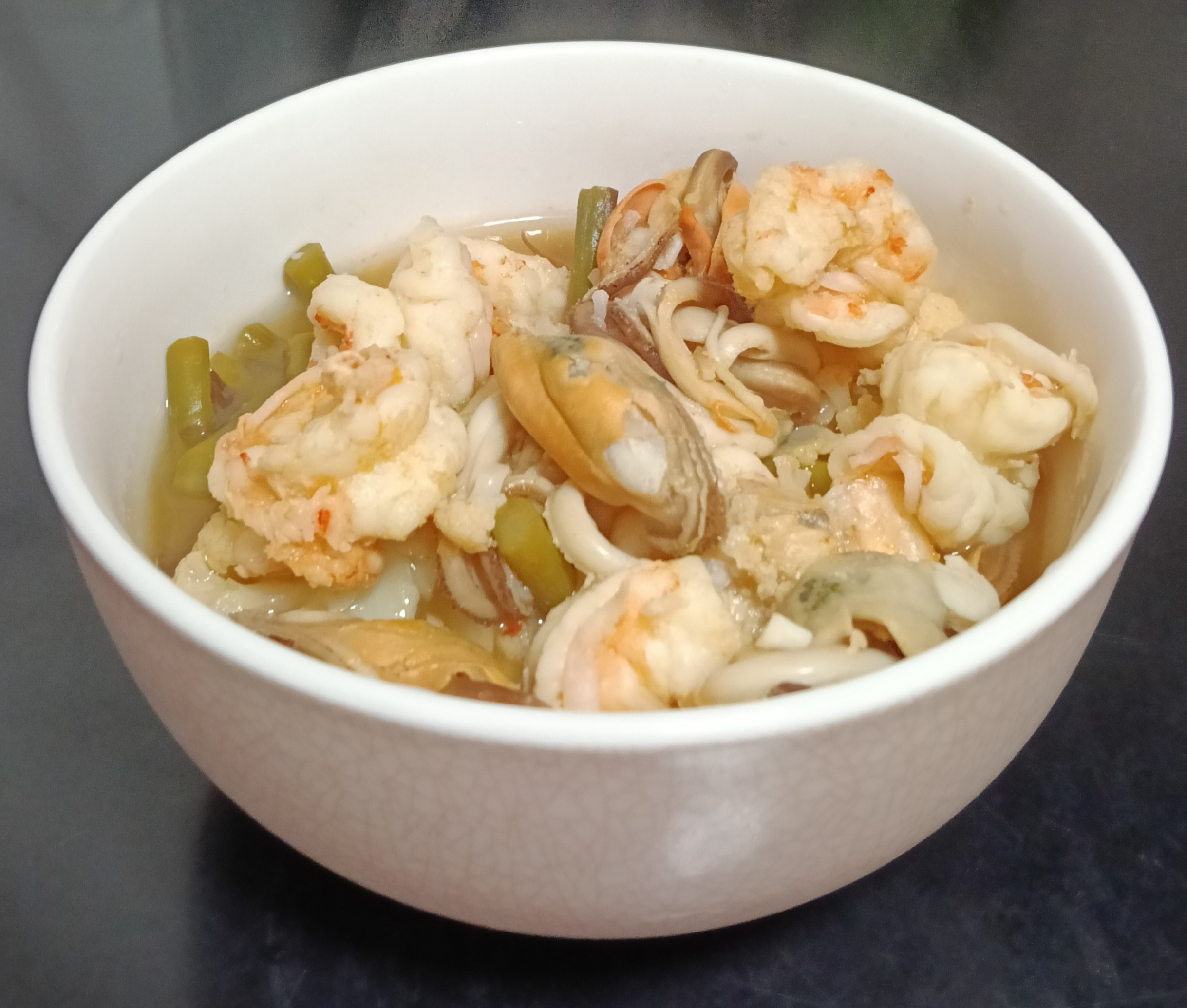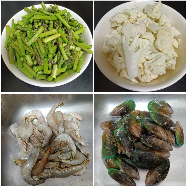 ล้างทำความสะอาดกุ้งและหอยแมลงภู่ให้สะอาด โดยหอยแมลงภู่ต้องล้างหลายๆน้ำ และลวกในน้ำร้อนเพื่อชำระล้างเศษดินและสิ่งสกปรกต่างๆออกให้หมด