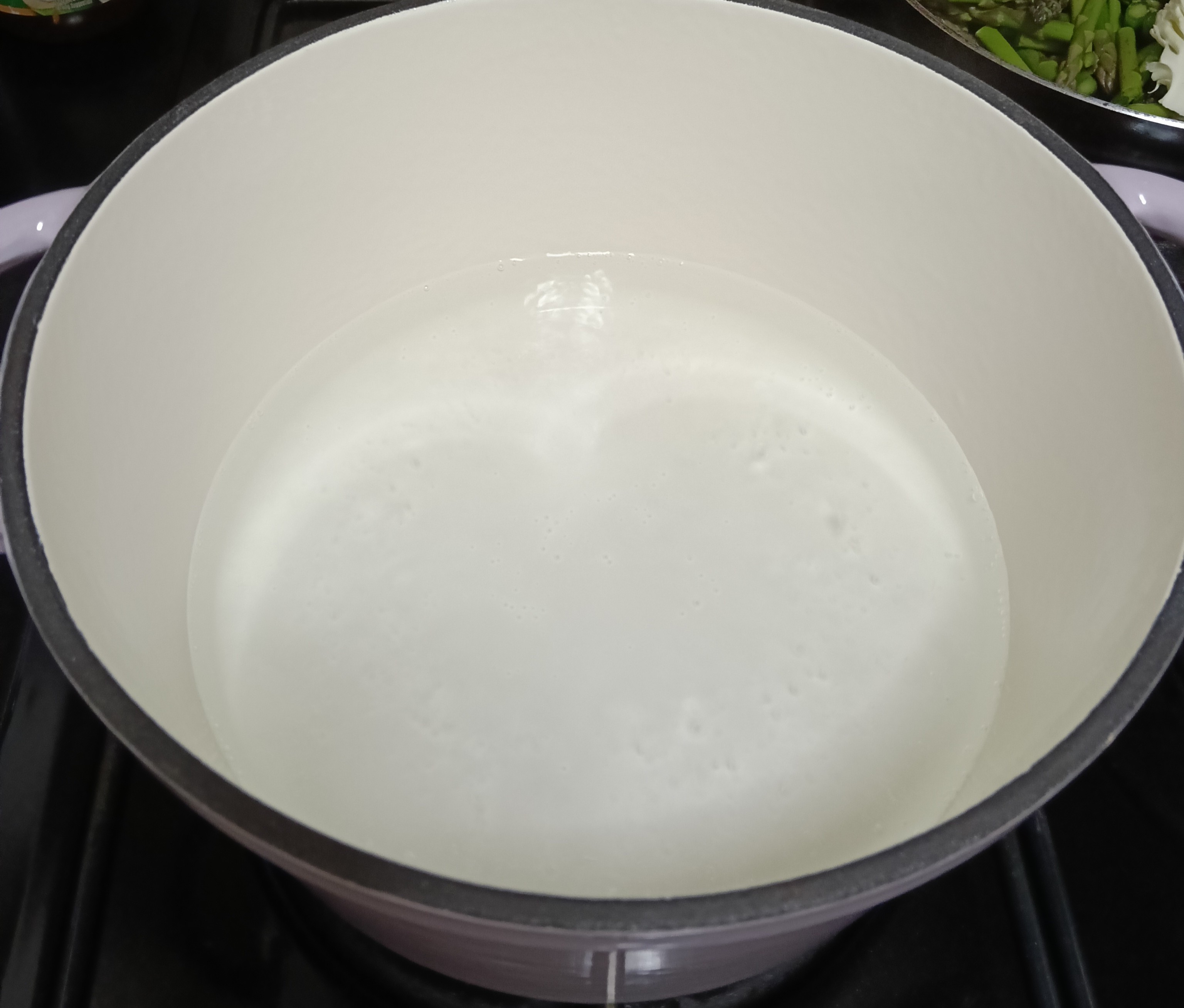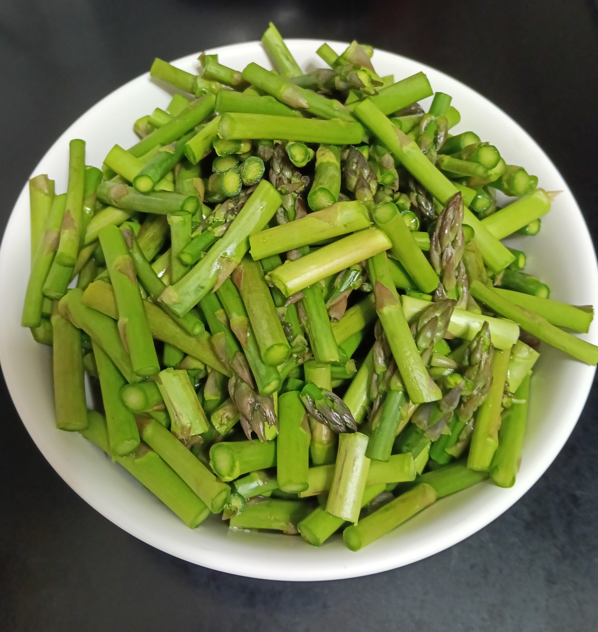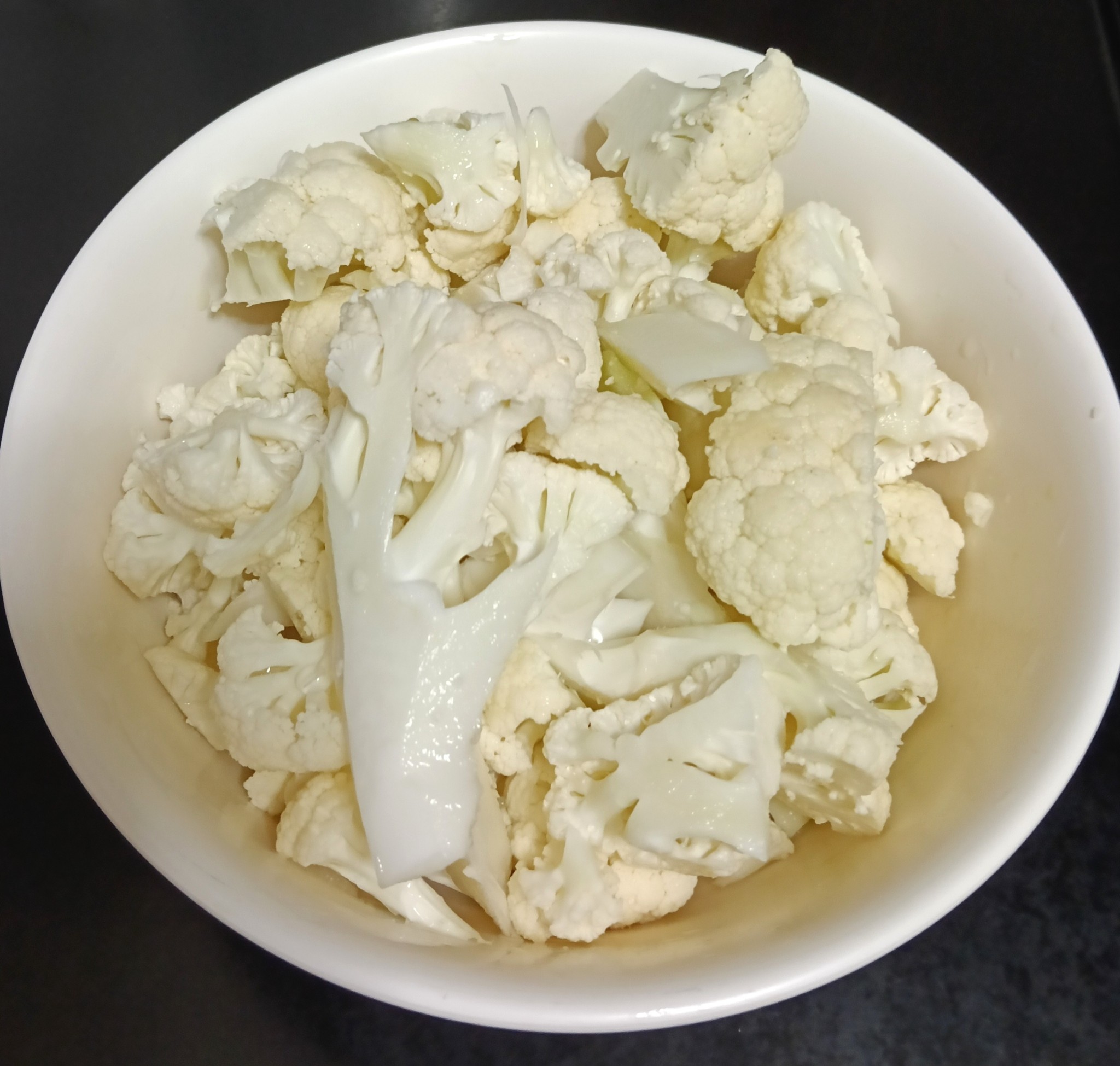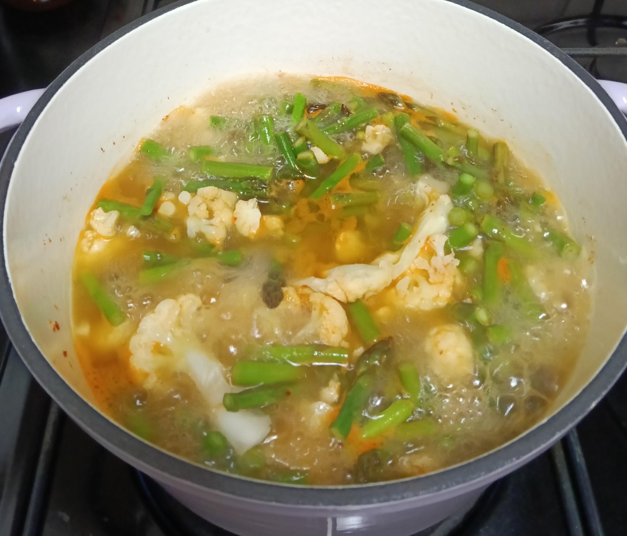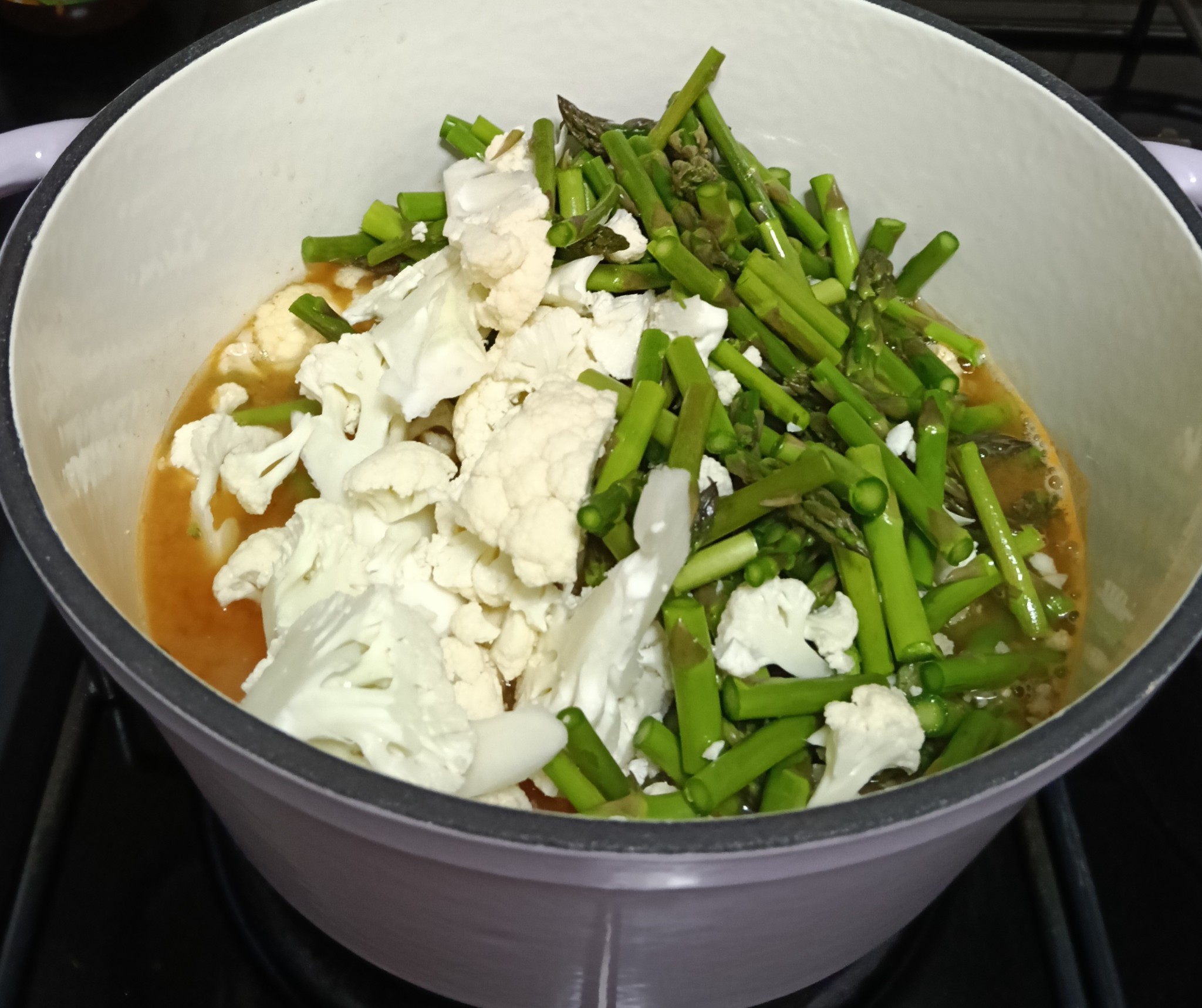 ล้างหน่อไม้ฝรั่งและกะหล่ำดอกให้สะอาดและหั่นเป็นชิ้นพอดีคำเตรียมไว้