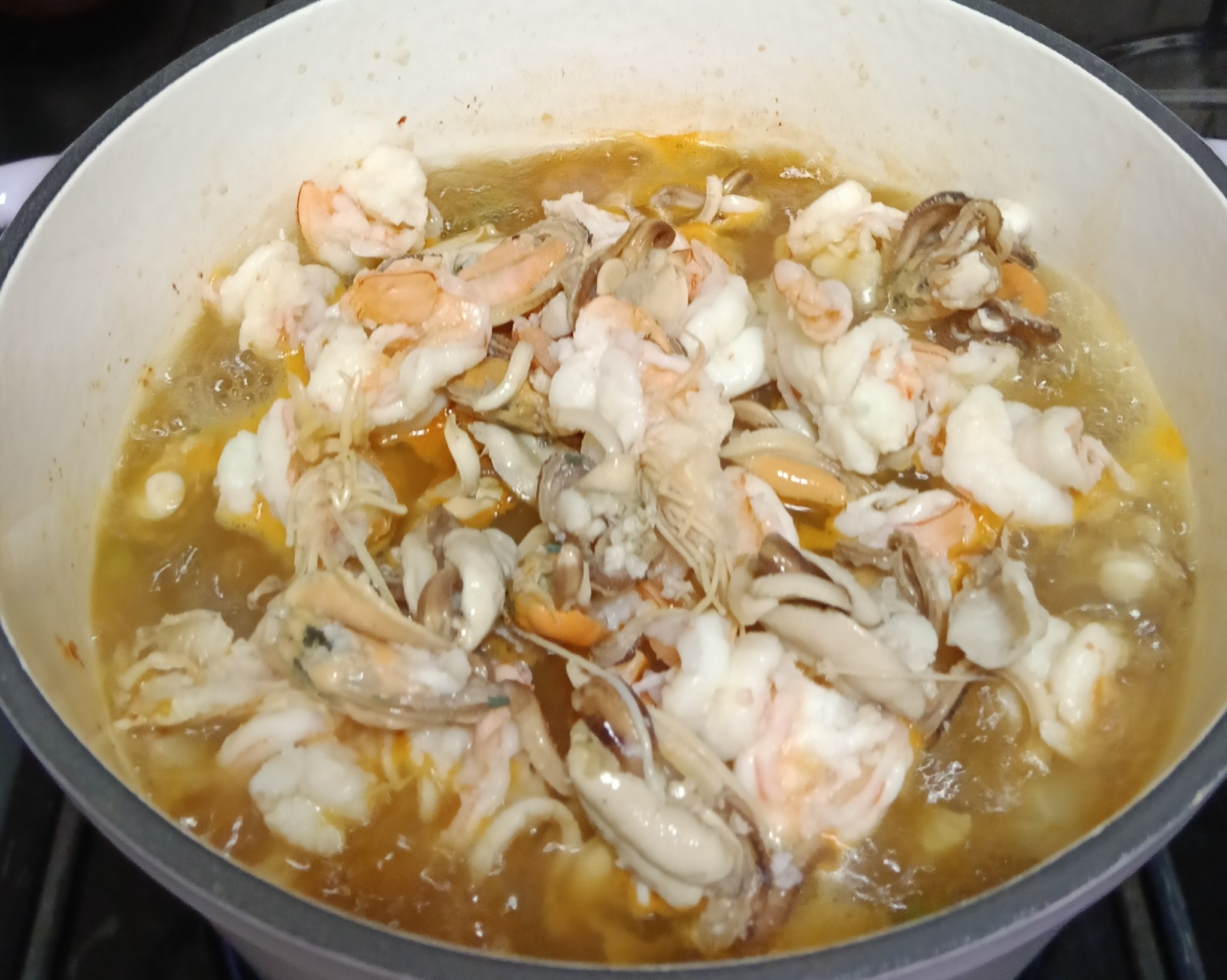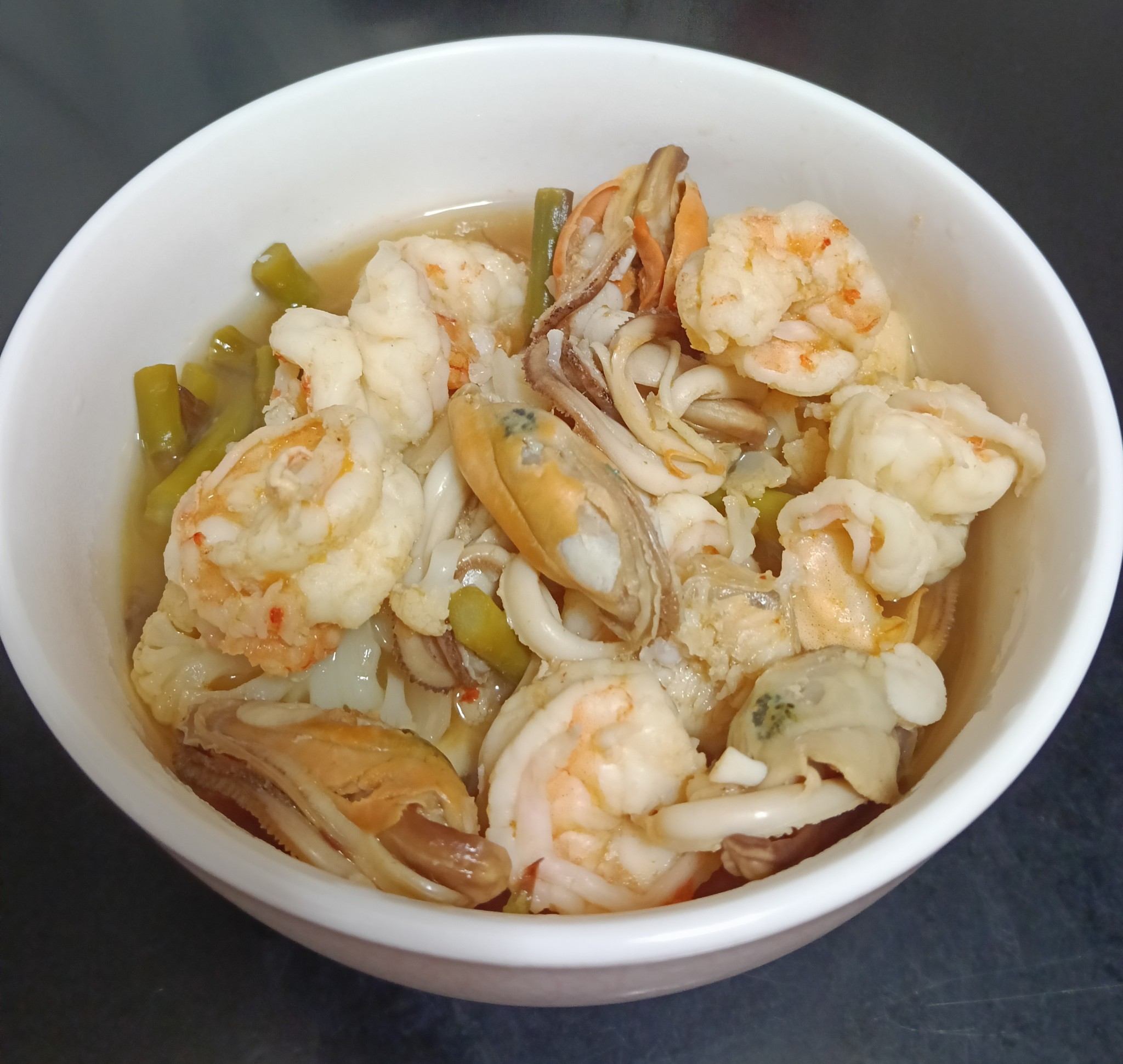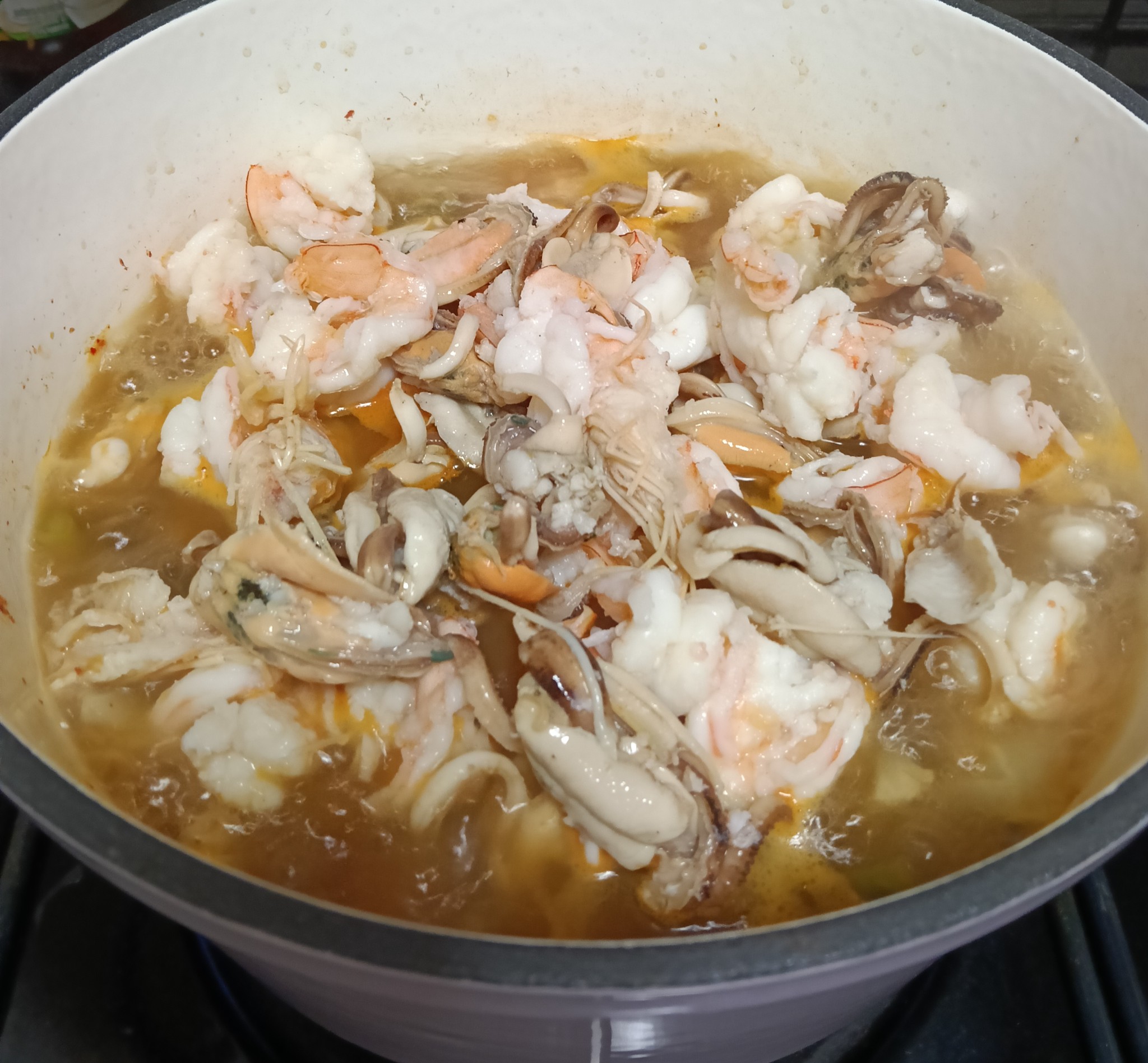 ใส่กุ้งและหอยแมลงภู่ที่ลวกไว้แล้วลงไป