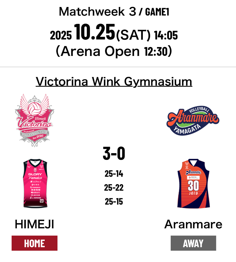 4.Victorina Himeji 3-0 Aranmare Yamagata (25-14 25-22 25-15) (75-51)