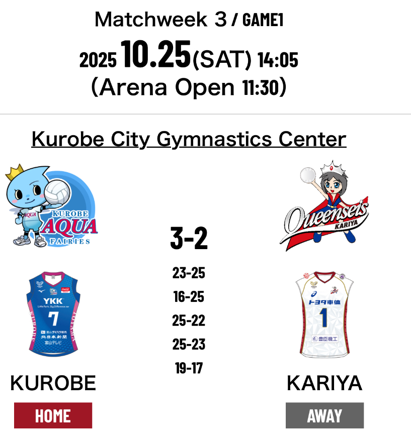 3.Kurobe Aqua Fairies 3-2 Queenseis Kariya (23-25 16-25 25-22 25-23 19-17) (108-112)