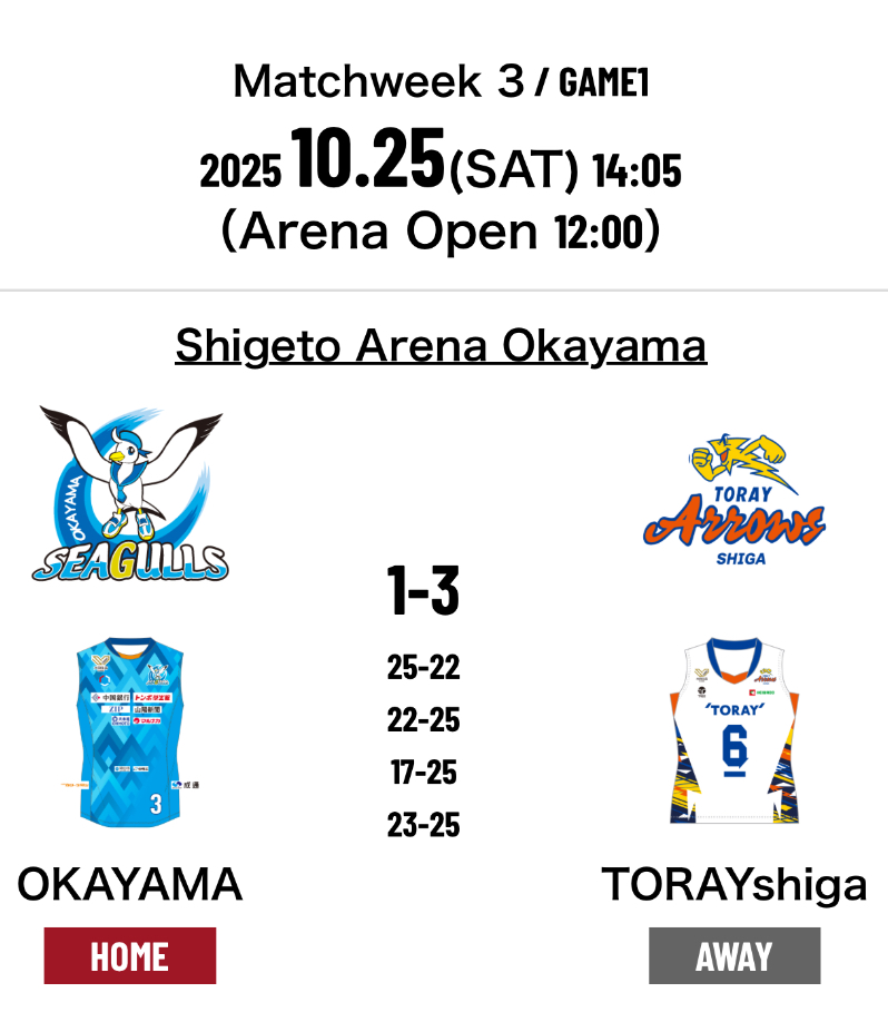 5.Okayama Seagulls 1-3 Toray Arrows Shiga (25-22 22-25 17-25 23-25) (87-97)