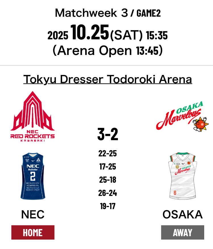 6.NEC Red Rockets Kawasaki 3-2 Osaka Marvelous (22-25 17-25 25-18 26-24 19-17) (109-109