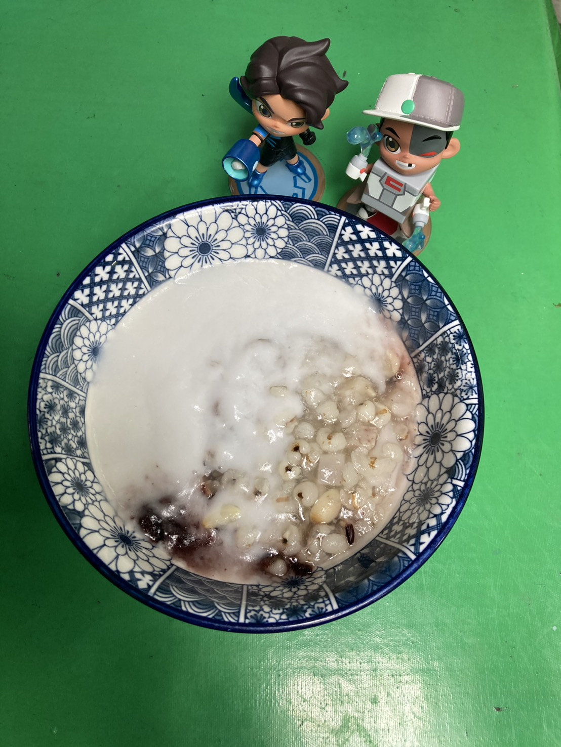 ลูกเดือยเปียกมีธัญพืชมีเม็ดบัว เผือก ผสมข้าวเหนียวดำอร่อยมากค่ะ ใส่กะทิเยอะๆ อีกถุงว่าจะเก็บไว้กินเอง น้องตื่นมาเสร็จมันค่ะ