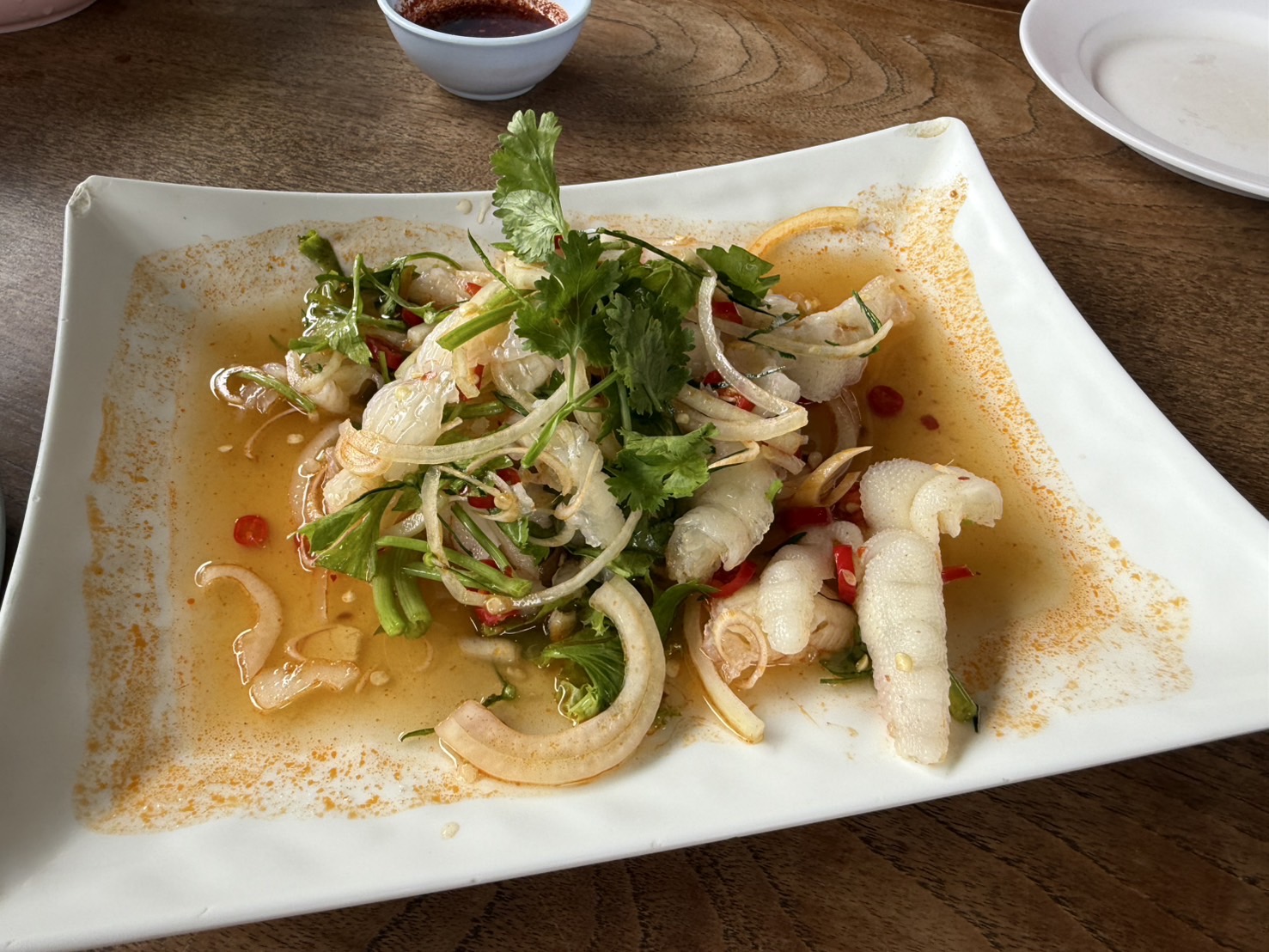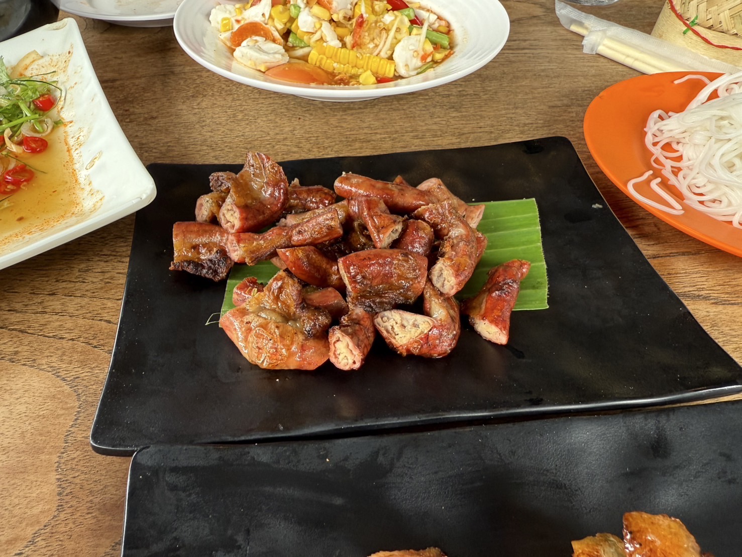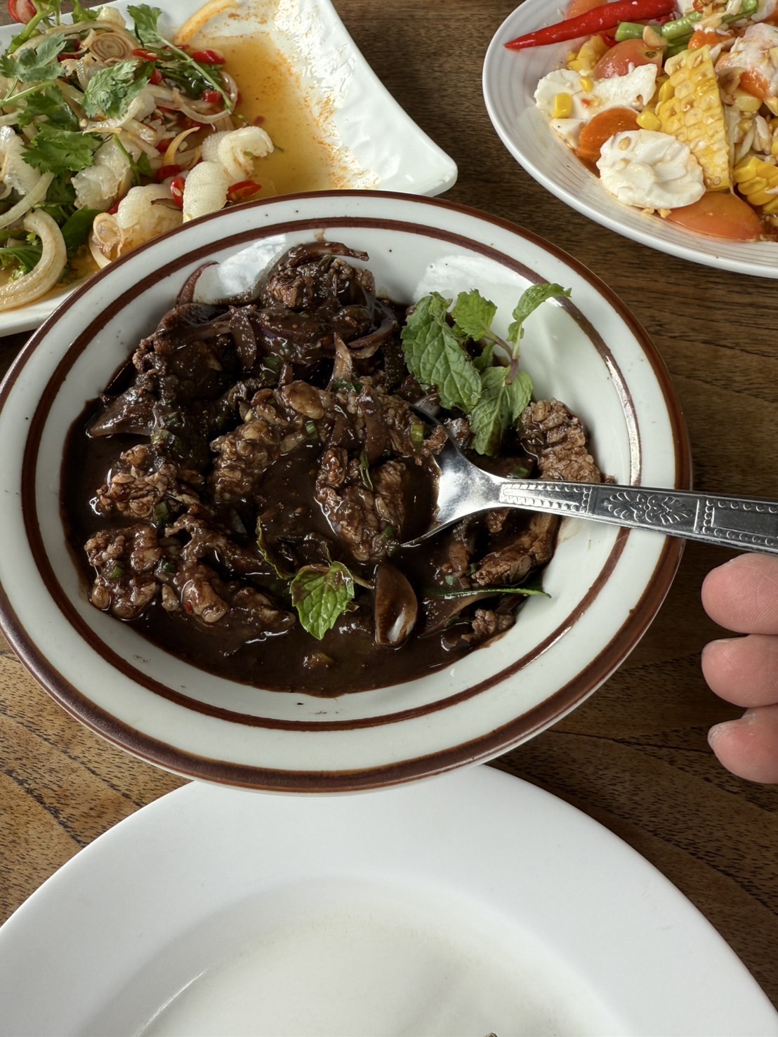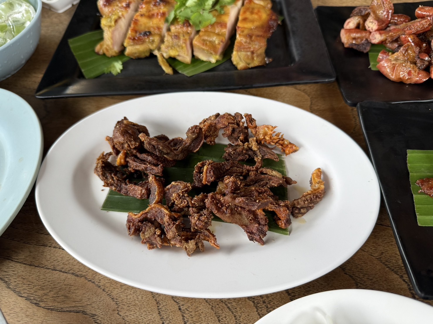 จระเข้ฟาดหาง เป็น เมนูที่เห็นแปลกเลยสั่งมาลอง ใช้เนื้อส่วนที่เรียกว่าจระเข้ (เนื้อแดงส่วนนึงของสะโพก ) ถ้าเป็นเนื้อสเต็คก้อคือ พิคานย่า (Piacanhaหรือ Sirloin cap) ผสมกับเครื่องในและเลือด แต่ใจไม่ถึงสั่งสุกหน่อย ออกมาดำๆ รสชาตินัวๆขมเล็กน้อยไม่จัด อร่อยดี