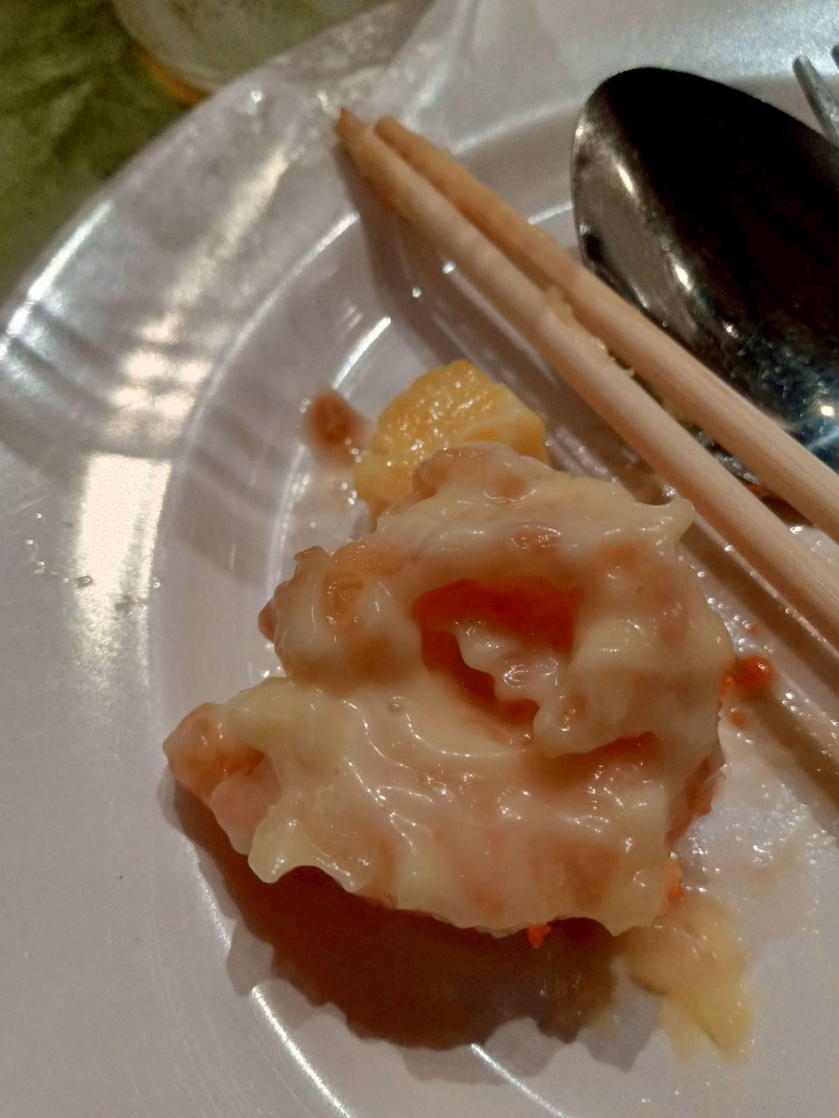 ผมเพิ่งเคยกินนี่ล่ะ กลิ่นเหมือนสาหร่ายชุบแป้งทอด คลุกแป้งกรอบ ๆ ข้างในเป็นวุ้นเส้นผัดใส่แครอท คือปอเปี๊ยะทอดเกาหลีใช่ไหมนะฮะ ก็แปลกใหม่ เร้าใจดี ซอสแดง ๆ เค็ม และ เปรี้ยวหน่อย ๆ ทีแรกคิดว่าจะเผ็