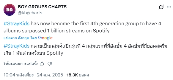 - Stray Kids กลายเป็นกลุ่ม K-Pop เจน 4 กลุ่มแรกที่มีอัลบั้มถึง 4 อัลบั้มที่มียอดสตรีมบน Spotify เกิน 1 พันล้านครั้ง