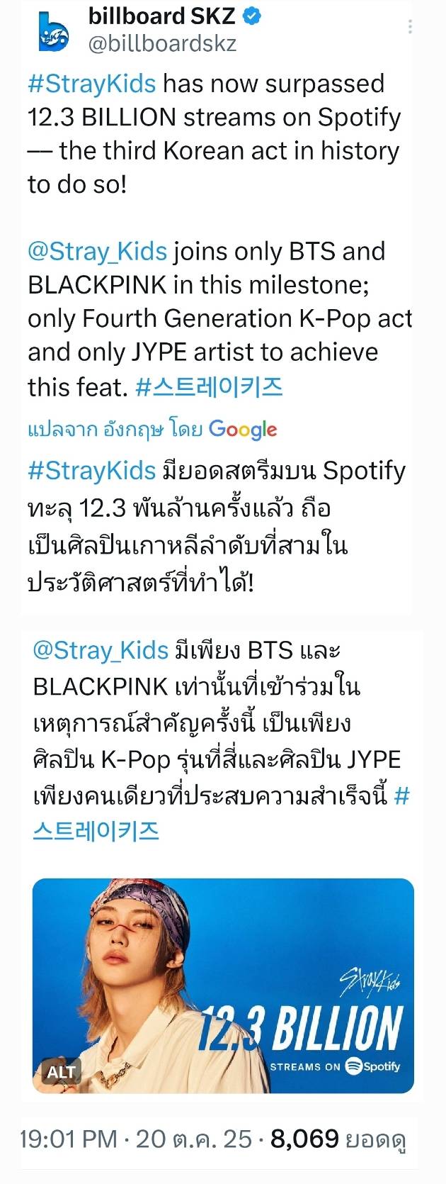 บทสรุปยอดรวมเพื่อความเข้าใจง่าย Stray Kids มียอดสตรีมบน Spotify ทะลุ หนึ่งหมื่นสองพันสามร้อยล้านครั้ง ถือเป็น Top 3 K-Pop ในประวัติศาสตร์ที่ทำได้!