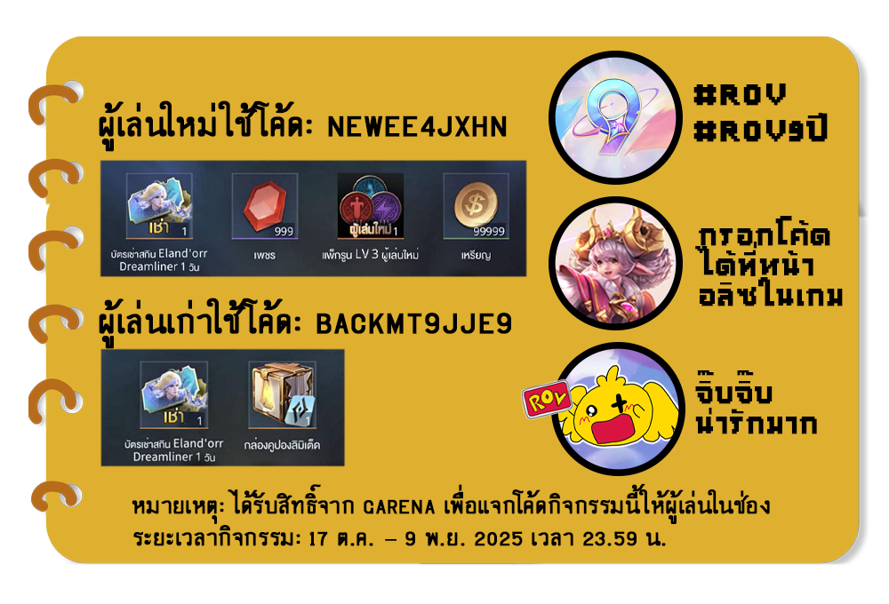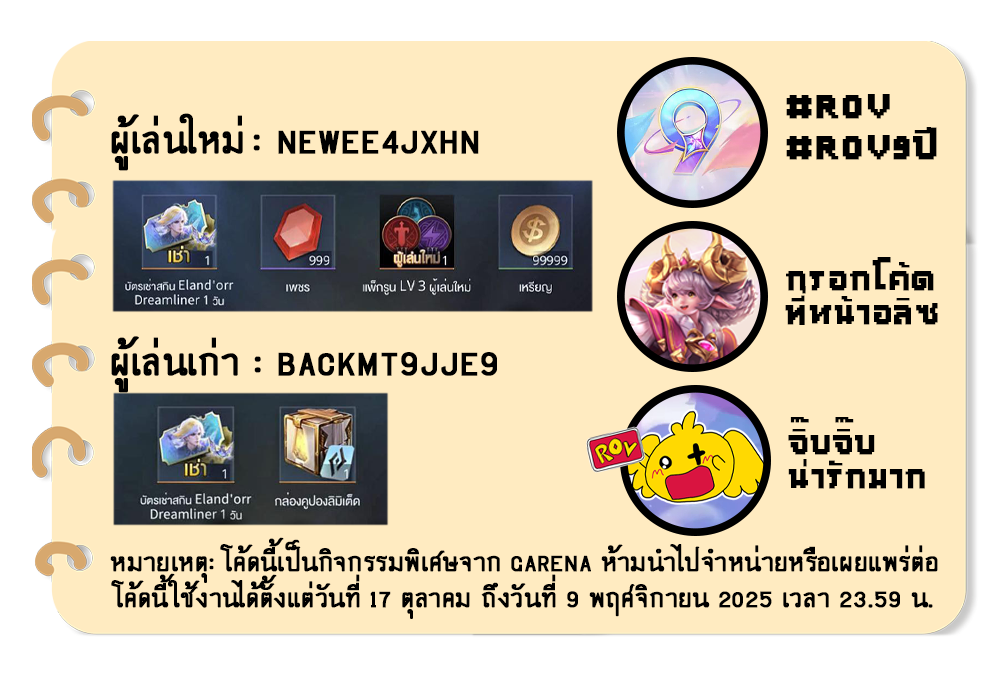 ช่วงนี้ RoV มีแจก “โค้ดกิจกรรมพิเศษ” ฉลองครบรอบ 9 ปี 🎂