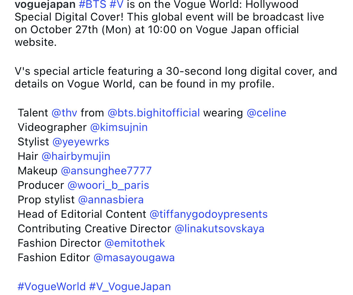 "ชื่อเขาเป็นที่รู้จักไปทั่วโลก ตลอดเวลา 12 ปีนับตั้งแต่เดบิวต์ในฐานะสมาชิก BTS เมื่อปี 2013 V ได้สร้างเส้นทางของตัวเองอย่างโดดเด่นและไม่เหมือนใคร ด้วยน้ำเสียงทุ้มลึกที่เป็นเอกลักษณ์และเสน่ห์เฉพาะตัว เขาเปี่ยมไปด้วยทั้งคาริสมาน่าหลงใหลบนเวทีและเสน่ห์ในชีวิตประจำวัน"