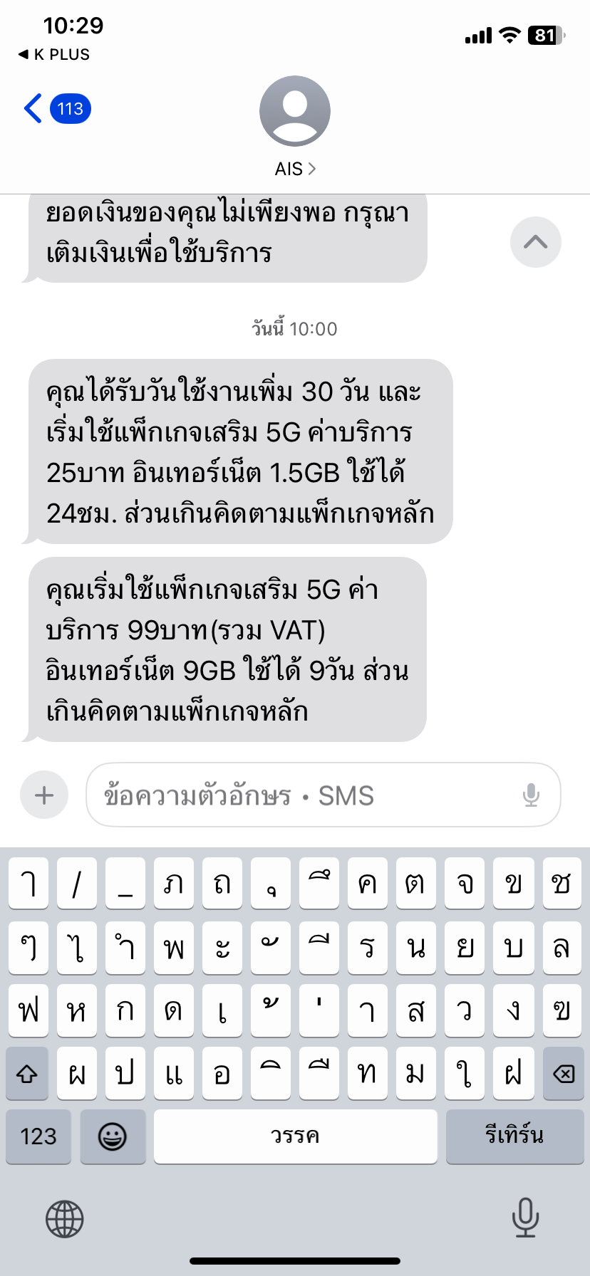 Ais เบอร์นี้เป็นเบอร์เติมเงิน ใช้เป็นเครื่องสำรอง ตอนแรกใช้โปรเหมาเหมา เดือนละ 150 บาท ได้เน็ต 4Mbpsไม่ลดสปีด(4Gเท่านั้น เคยเช็คแล้วโปรนี้ไม่ใช่โปร5G) มี SMS ส่งเข้ามาตามภาพ แนะนำโปร 5G 6Mbps 200 บ./เ