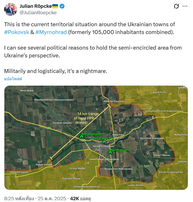 ในภาพจะเห็นได้ว่าเมืองข้างๆ ที่ชื่อ Myrnohrad ก็เริ่มถูกปิดล้อมไปแล้วด้วย หากเมือง Pokrovsk แตกเมื่อใด เมือง Myrnohrad ก็จะวิกฤตตามไปทันที เพราะฝั่งยูเครนจะไม่สามารถส่งกำลังมาช่วยได้ และทหารที่อยู่ในเมืองมีแค่ 2 ทางคือ จำนน หรือฝ่าวงล้อมออกจากเมือง