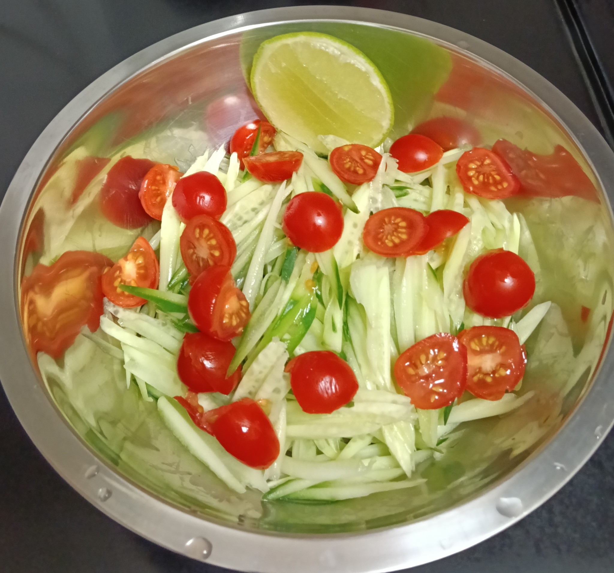 สับแตงกวาเตรียมไว้ หั่นมะเขือเทศ และมะนาวเตรียมไว้