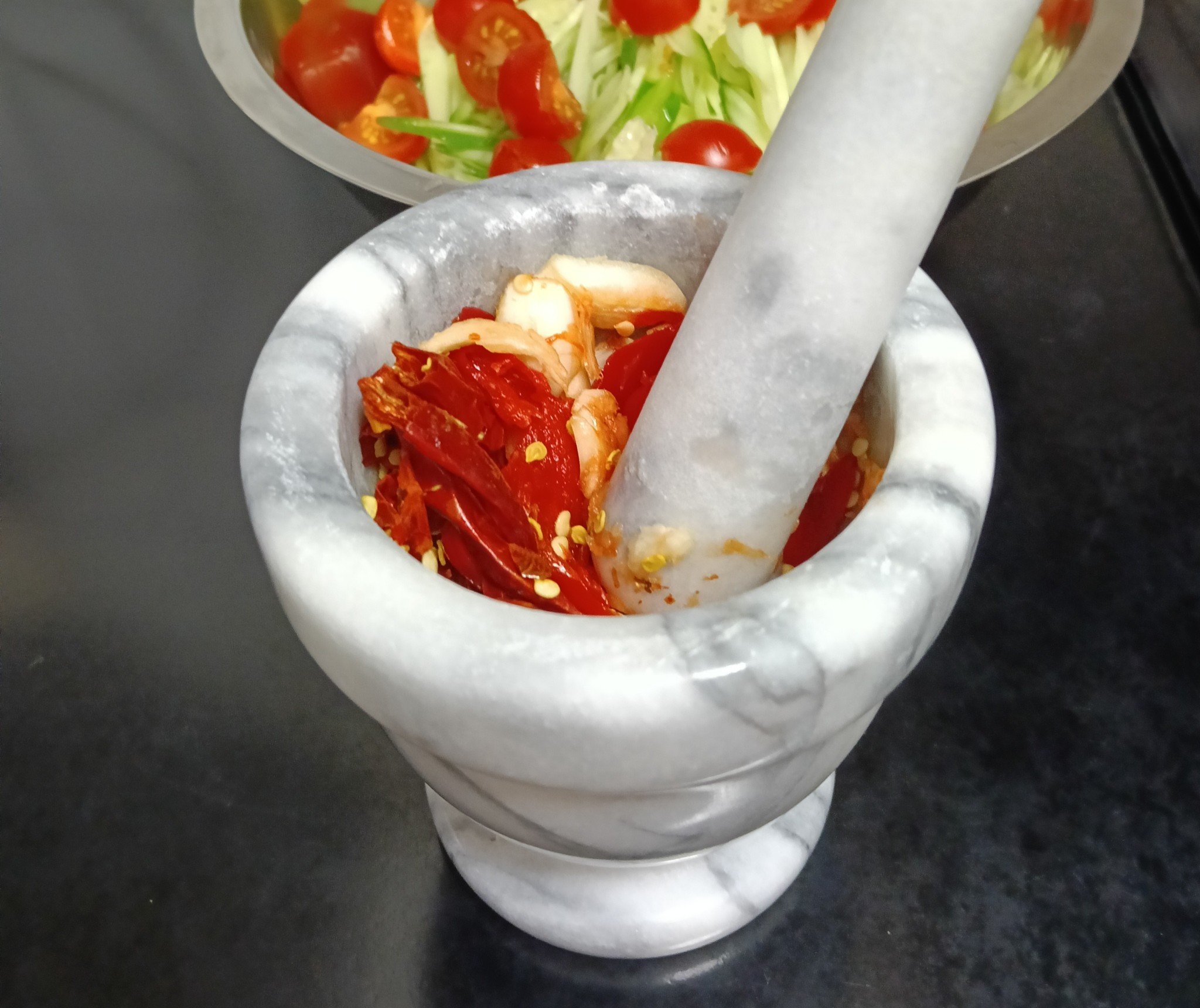 ตำพริกสด พริกแห้ง และกระเทียมให้ละเอียดพอประมาณ ปรุงรสด้วยน้ำตาลมะพร้าว น้ำปลา น้ำมะขาม น้ำมะนาว และผงชูรส