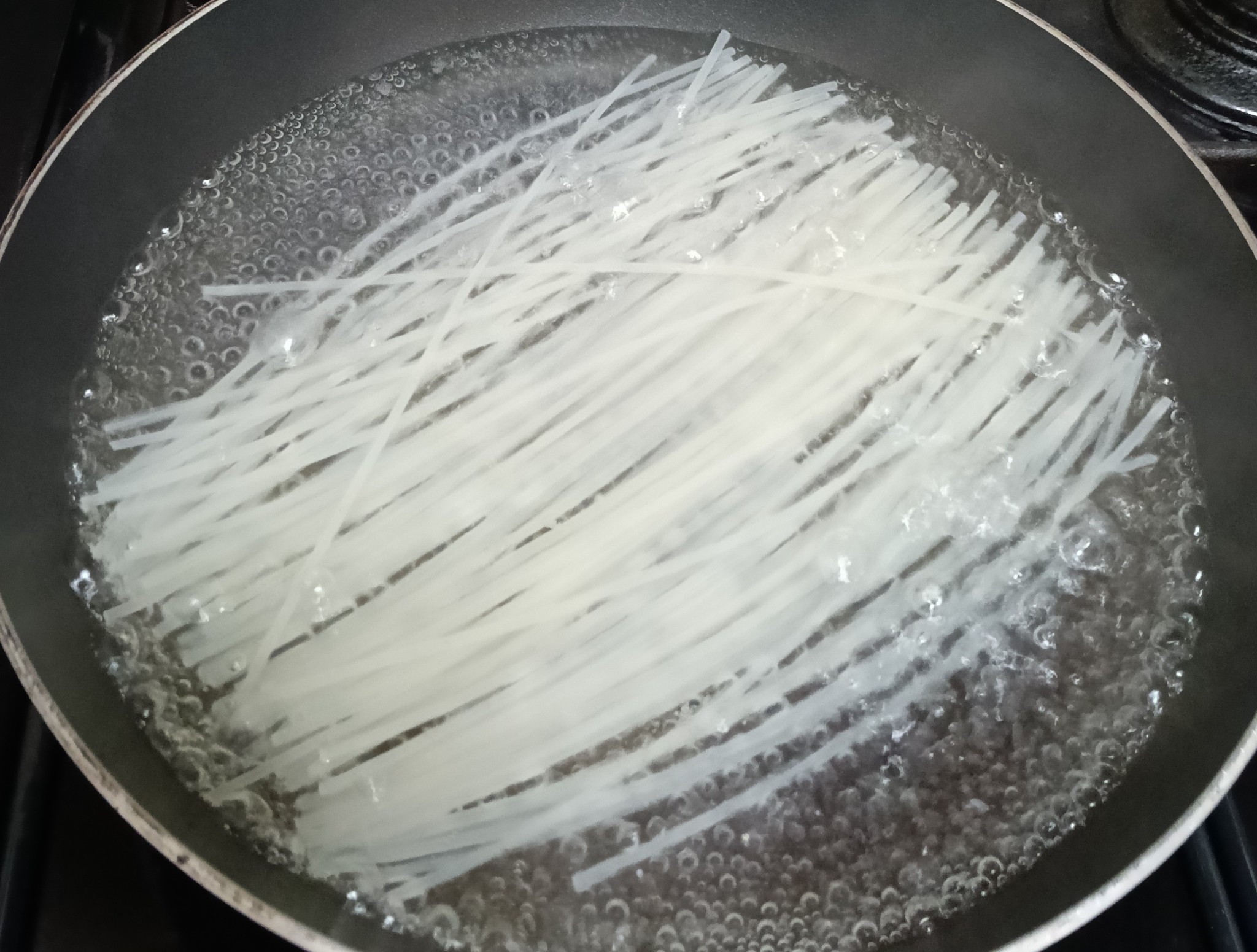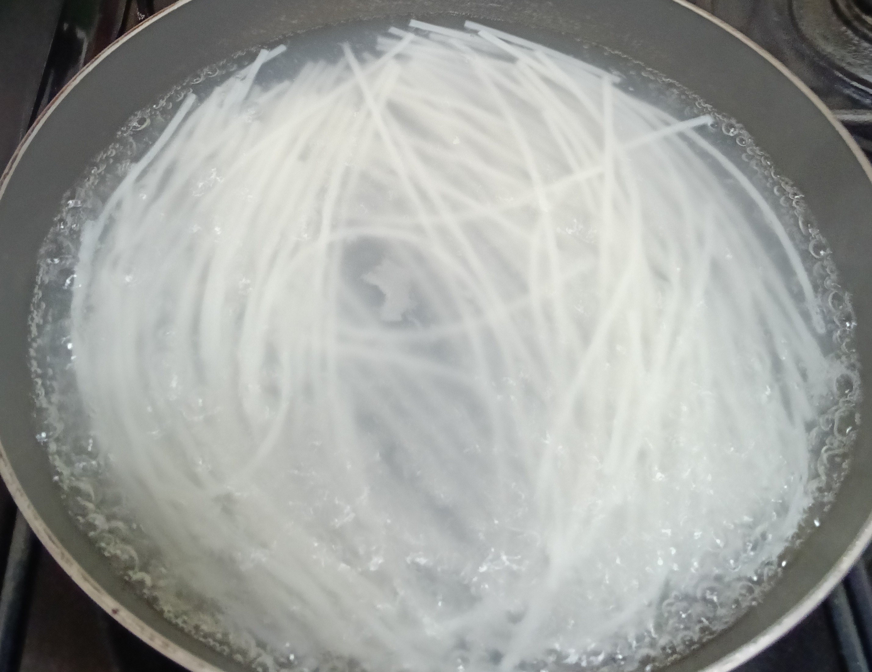 มาต่อด้วยการต้มเส้นขนมจีนอบแห้ง ต้มประมาณ 8-9 นาที แล้วก็ล้างออกด้วยน้ำเย็นอีก 1 นาที