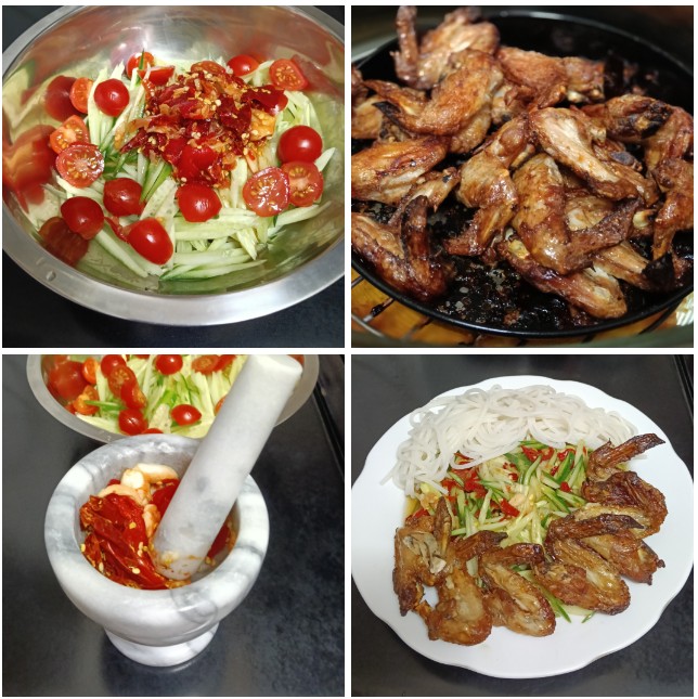 เมนูวันหยุด อาหารเที่ยงรสแซ่บวันนี้ ตำแตง ปีกไก่ย่าง ขนมจีน #อาหารไทยในต่างแดน 🥒🌶️🌶️🌶️🍗🍜🍽️😋