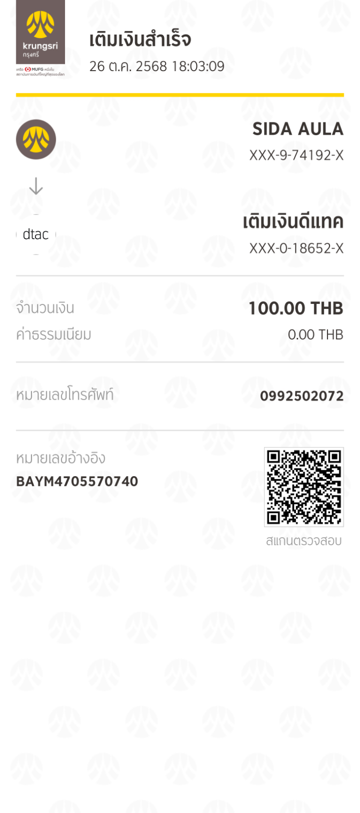 เติมเงินผิดเบอร์ค่ะจากเเอปธนาคาร เติมไป100 เบอร์0992502072วันที่26ต.ค.68 เวลา18:03:09จะเติมเข้าเบอร์0823671596 ดีเเทคนะคะ