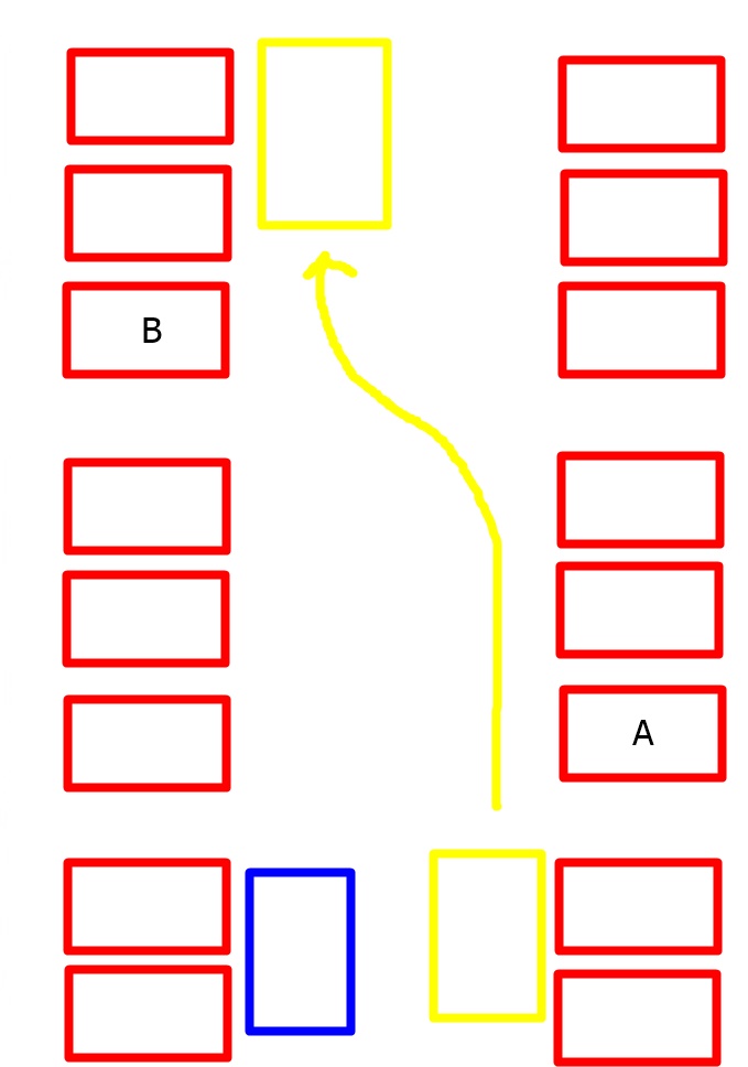 คันเหลืองขับตามมา และเลยไป ขณะนั้น คัน B ออกจากช่องก่อน คัน A (คันเหลืองเลยขับขึ้นไป เปิดไฟฉุกเฉินเพื่อจะจอดแทนคัน B)