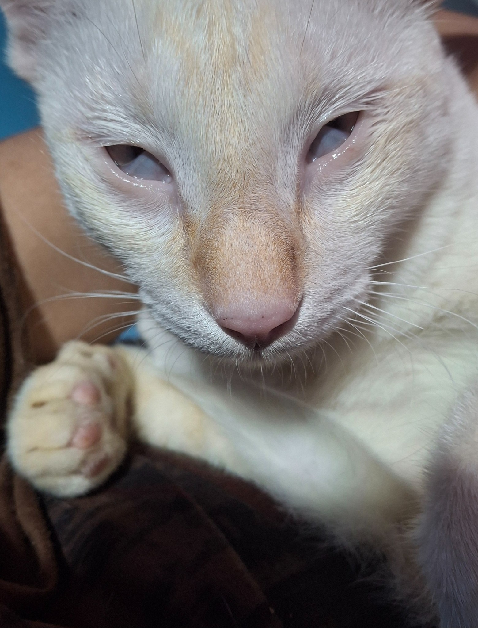 แมวอายุ 16 ปีแล้ว ตาอักเสบ แดงและน้ำตาไหล เห็นกระจกตาเป็นฝ้าขาวๆ หยอดตาด้วยยาป้ายตา Terramycin มาเกือบเดือนแล้ว ปกติเป็นตาอักเสบประจำเดือนเว้นเดือน ป้ายตา 3-5 วันก็จะหาย แต่รอบนี้นานผิดปกติ คิดว่าจะพา