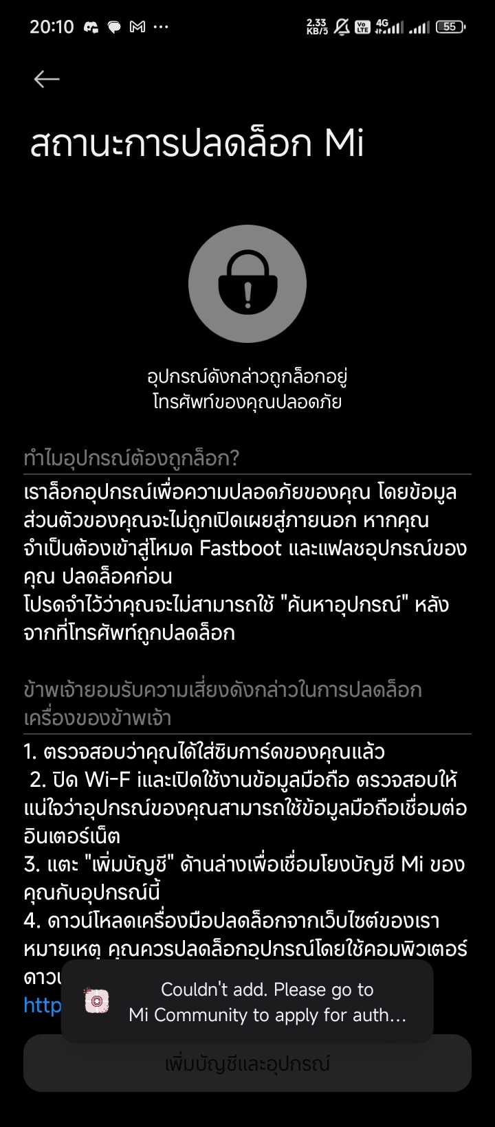 ปัญหาของผมคือว่าตอน เพิ่มบัญชีตรง mi unlock status