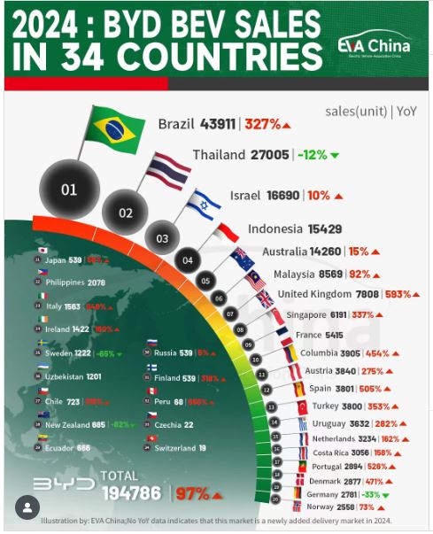ในปี 2567 บีวายดีจำหน่ายรถยนต์ไฟฟ้า (BEV) จำนวน 194,786 คัน ใน 34 ประเทศ เพิ่มขึ้นเกือบสองเท่าเมื่อเทียบกับปี 2566