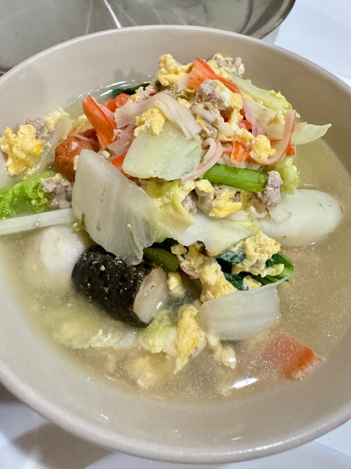 เราเพิ่มหมูบด ปูอัด ผักกาดขาว และไข่ไก่2 ฟองลงไปด้วยจ้า