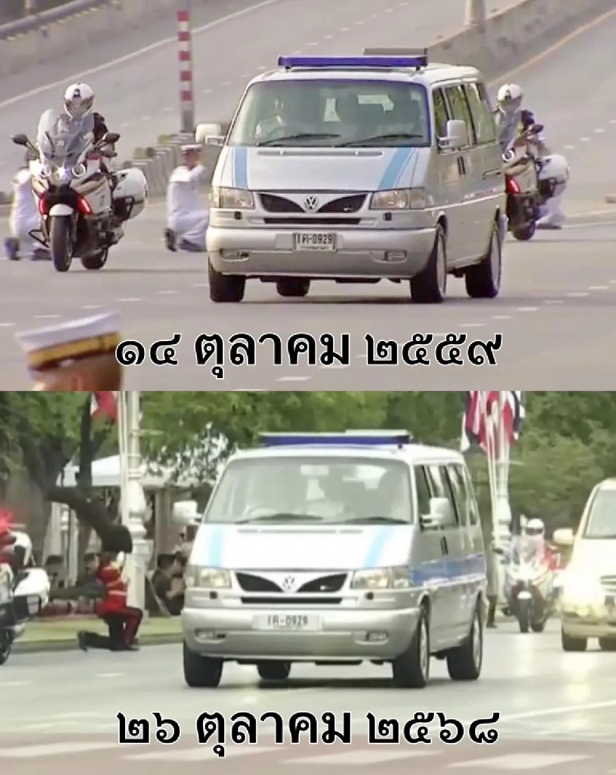 วันที่ 26 ตุลาคม 2568 เวลา 16.21 น. ขบวนอัญเชิญพระบรมศพ สมเด็จพระนางเจ้าสิริกิติ์ พระบรมราชินีนาถ พระบรมราชชนนีพันปีหลวง เคลื่อนออกจากโรงพยาบาลจุฬาลงกรณ์ สภากาชาดไทย มุ่งหน้าสู่พระบรมมหาราชวัง โดยรถยนต์พระที่นั่งโฟล์คสวาเกน คาราเวล V6 หมายเลขทะเบียน 1ด-0929 ซึ่งเป็นรถพระที่นั่งคันประวัติศาสตร์ที่หลายคนรู้จักกันในชื่อว่า “เจมส์ บอนด์”