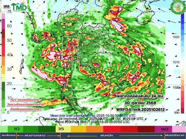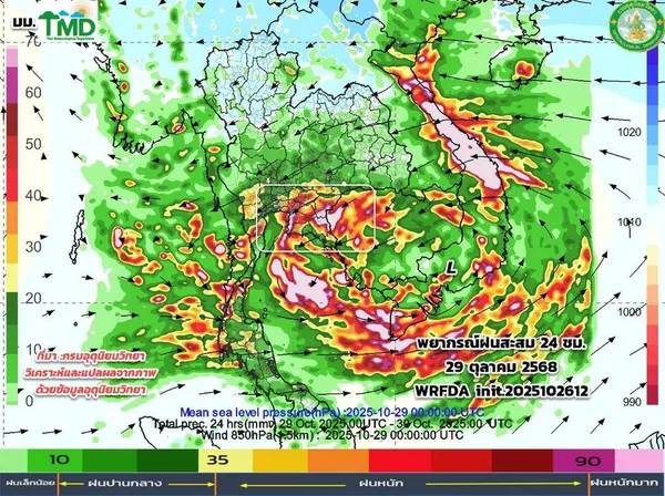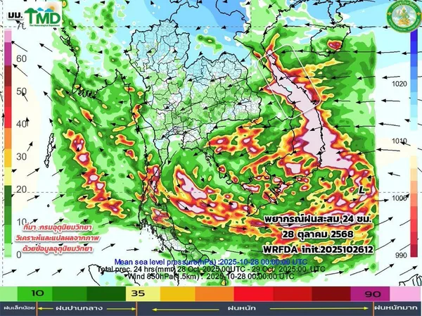 กรมอุตุนิยมวิทยาคาดการณ์ 28 ต.ค. – 1 พ.ย. ประเทศไทยตอนบนมีฝนเพิ่มขึ้นและมีฝนตกหนักบางแห่ง เนื่องจากหย่อมความกดอากาศต่ำบริเวณทะเลจีนใต้ตอนล่างจะเคลื่อนเข้าปกคลุมประเทศเวียดนามตอนล่าง ส่วนภาคใต้ระวังฝนตกหนักต่อเนื่องถึง 1 พ.ย.นี้