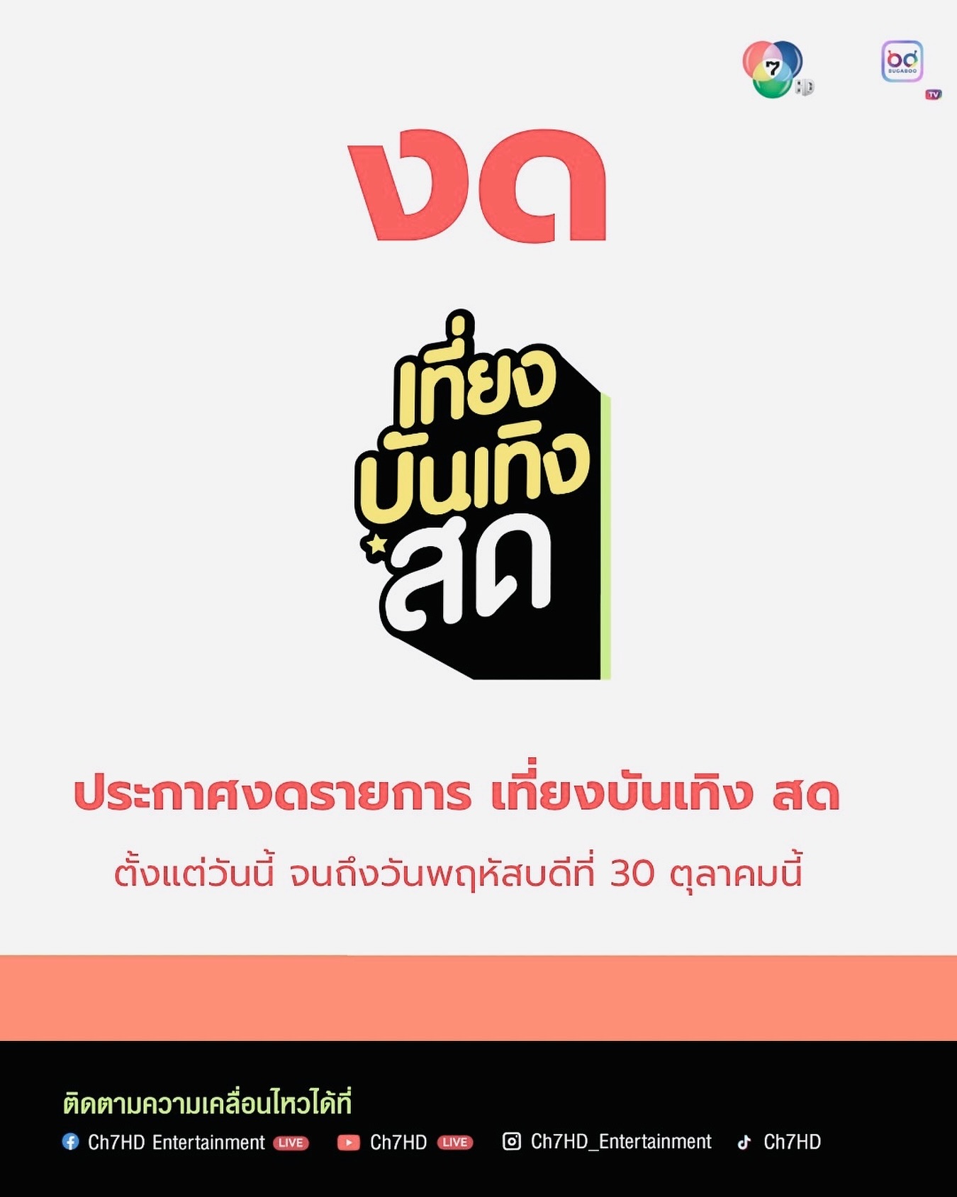 งดออกอากาศรายการ ”เที่ยงบันเทิง สด“ วันจันทร์ที่ 27 - วันพฤหัสบดีที่ 30 ตุลาคม 2568