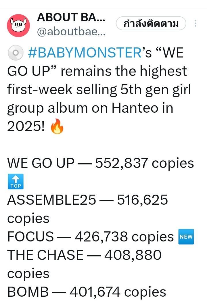 BABYMONSTER "WE GO UP" ของวงเกิร์ลกรุ๊ปรุ่นที่ 5 ยังคงเป็นอัลบั้ม ที่มียอดขายสัปดาห์แรก สูงสุดบน Hanteo ในปี 2025