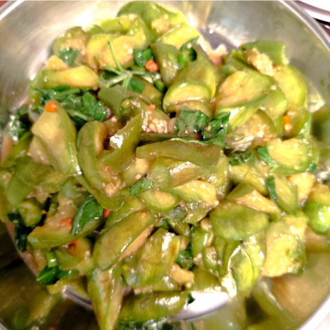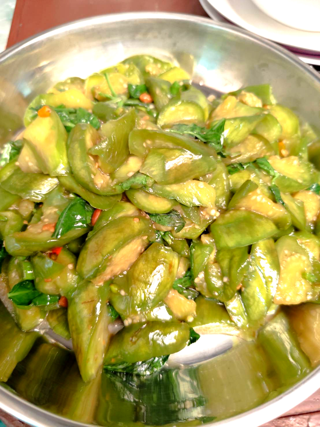 แล้วใส่มะเขือยาว และพริกขี้หนู ลงไปผัด ไม่ต้องคนเยอะมาก