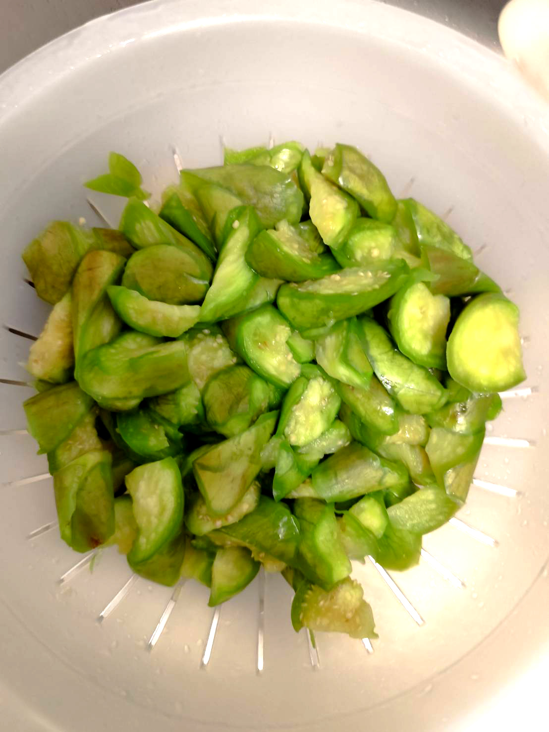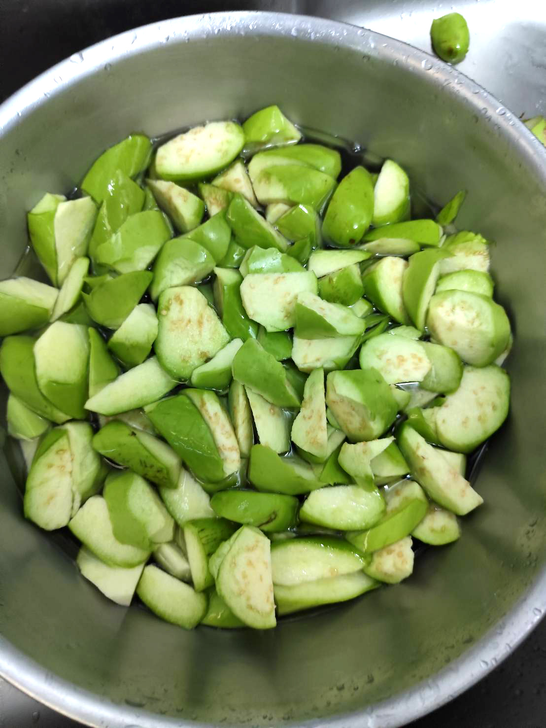 มะเขือยาว เราหั่นแล้วเอาไปแช่ในน้ำเกลือ