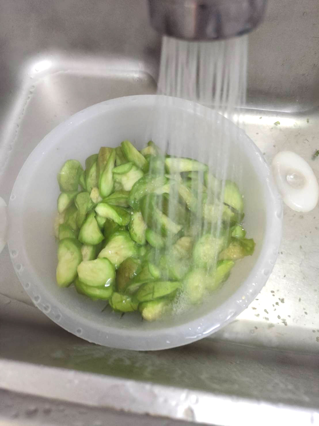 ตักขึ้นมาใส่น้ำเย็น ก็จะได้มะเขือยาวที่สียังสวย น่ากิน และไม่ดำ