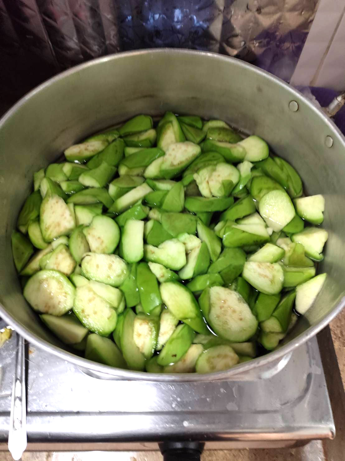 ต้มน้ำให้เดือดแล้วใส่มะเขือยาวลงไปต้มให้สุกและนิ่ม